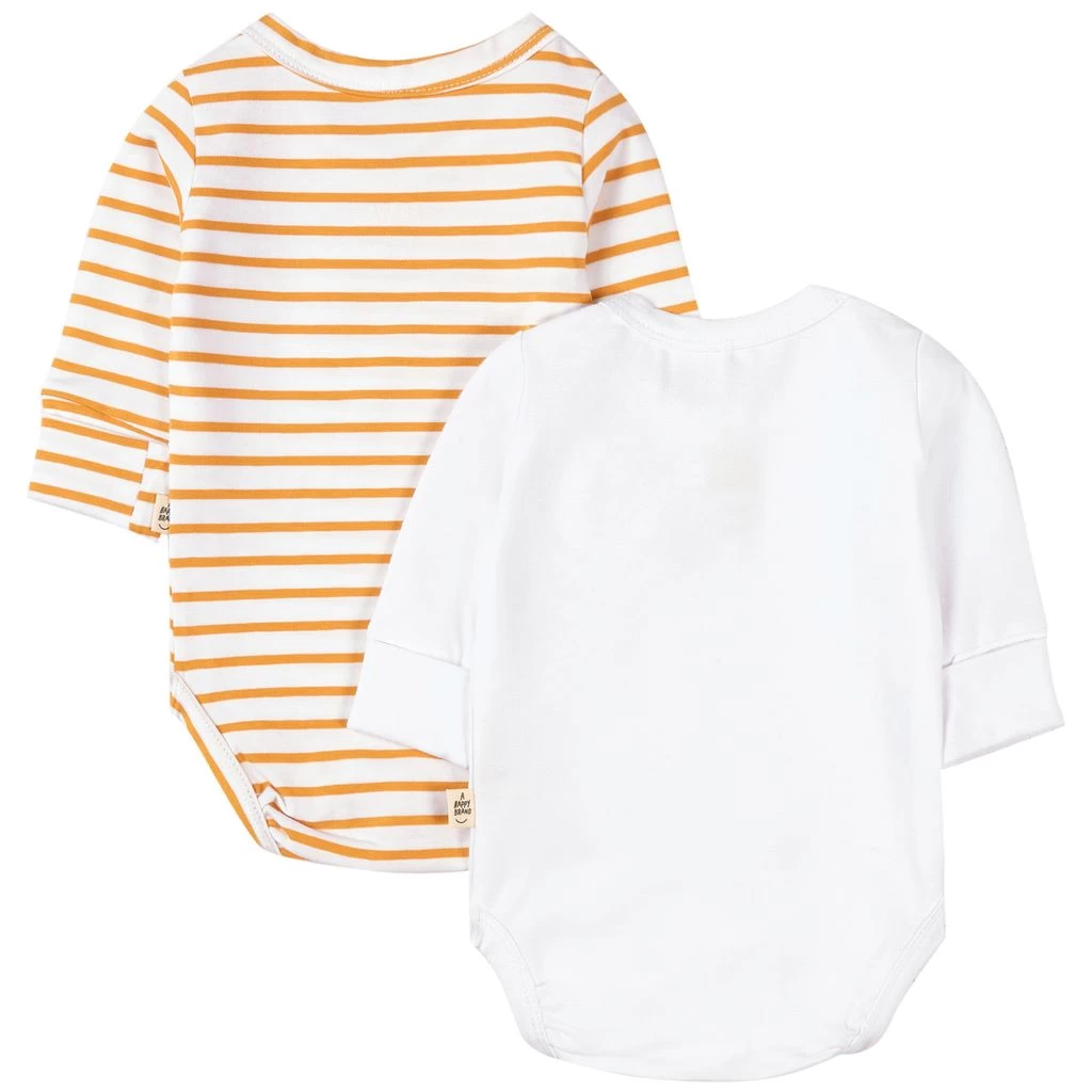 Yellow, striped baby body by A Happy Brand. The baby body has folded cuffs. It has a snap button closure on the shoulder and between the legs.
