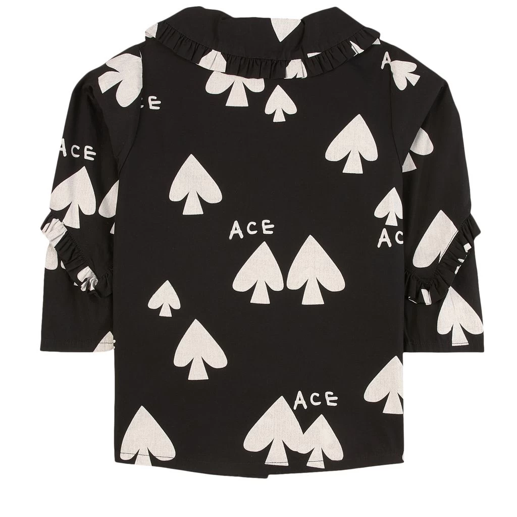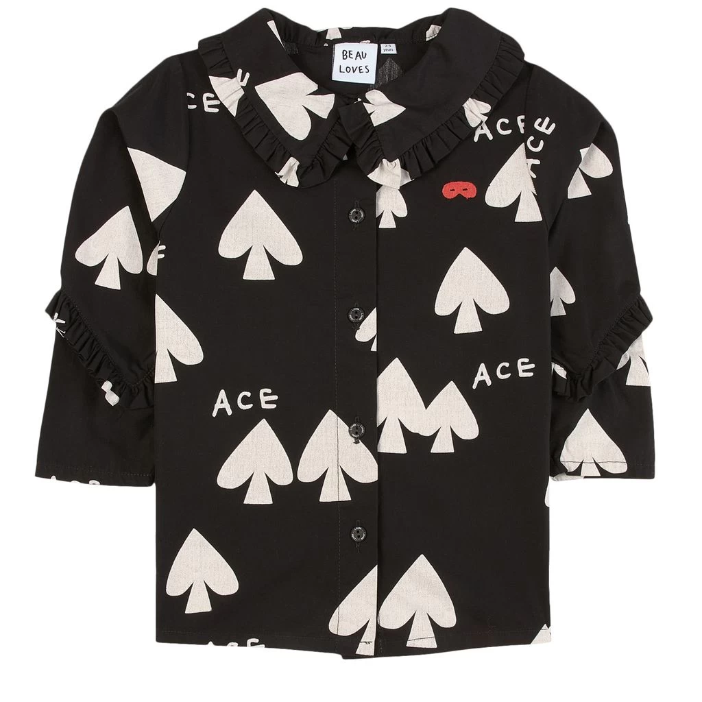 Black Ace blouse by Beau Loves. The blouse is made in Portugal and has an all-over print. It has ruffle details on the collar and on the sleeves and a button closure at the front.