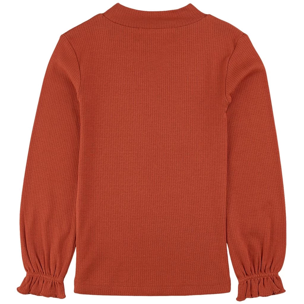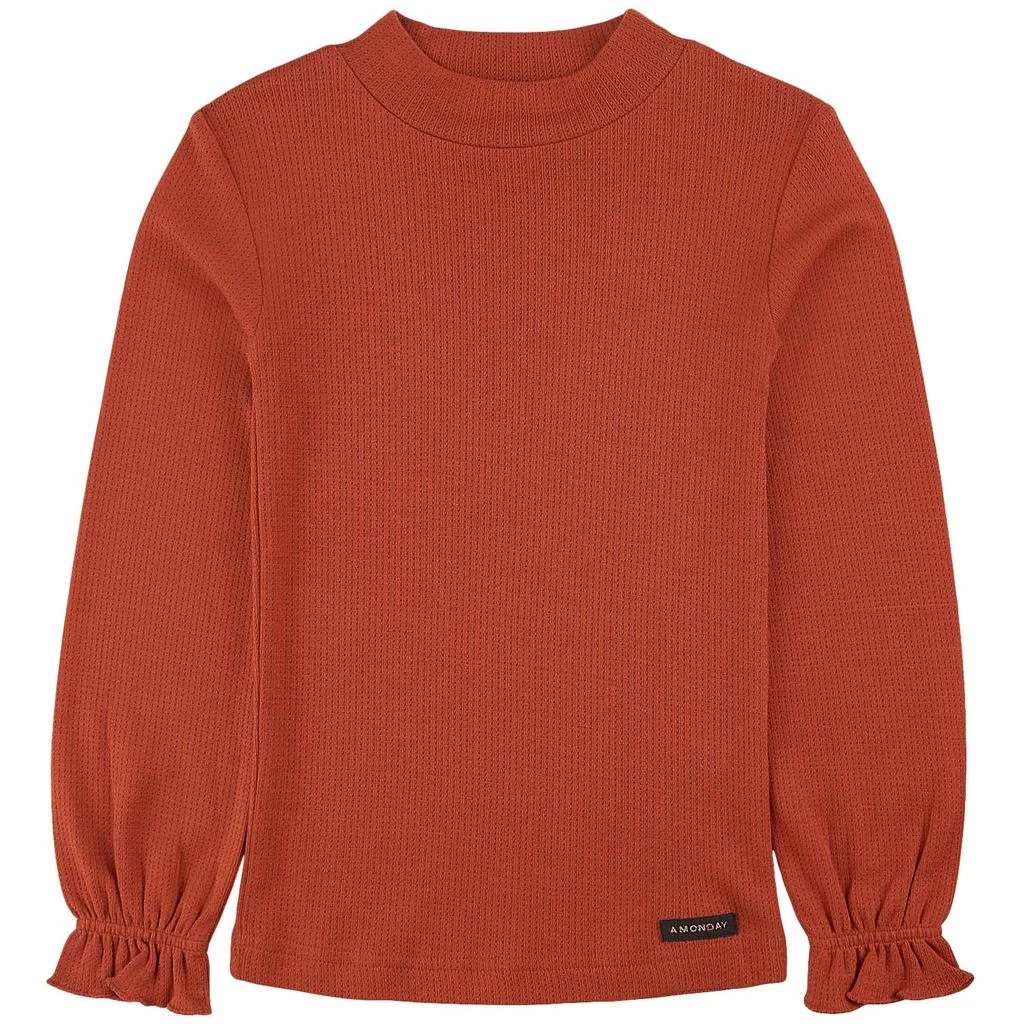 A simple yet stylish outfit. Orange Amelia T-Shirt by A Monday in Copenhagen. The T-Shirt has pointelle details all over. It has a high collar and elasticated ruffle sleeves.