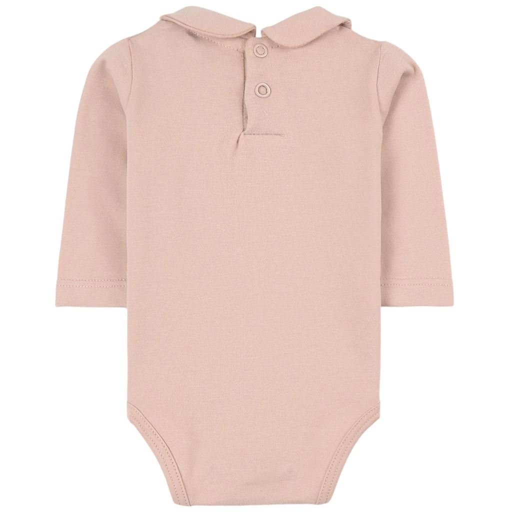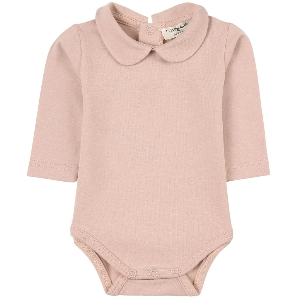 Pink Anette baby body by 1+ In The Family. The baby body has a Peter Pan collar. It has snap buttons at the back and between the legs.