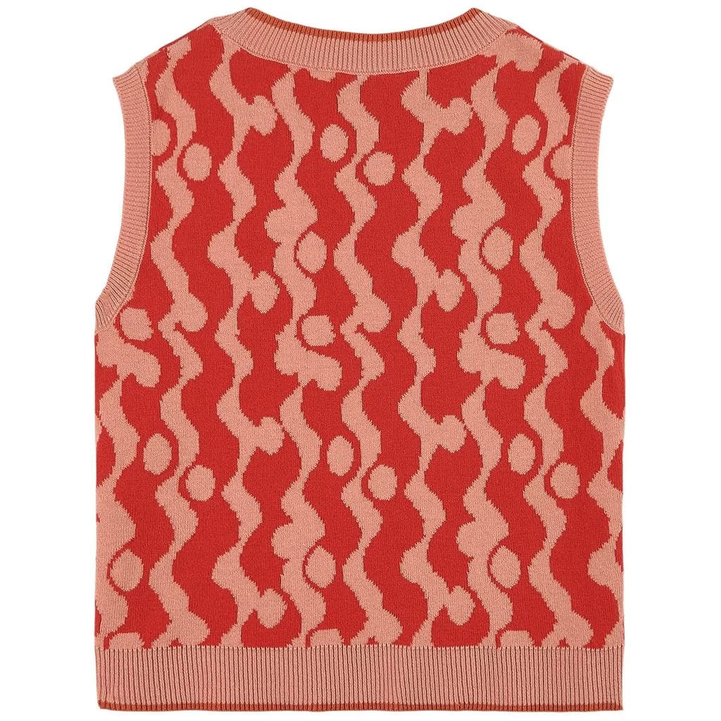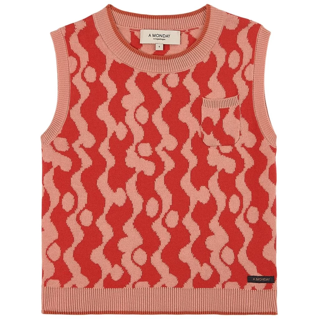 Knitwear is always the right choice. Red Bibaya vest by A Monday in Copenhagen. The vest has an abstract all-over print. It has a knitted design, a ribbing around the neckline, at sleeve opening and at the hem and a small front pocket.