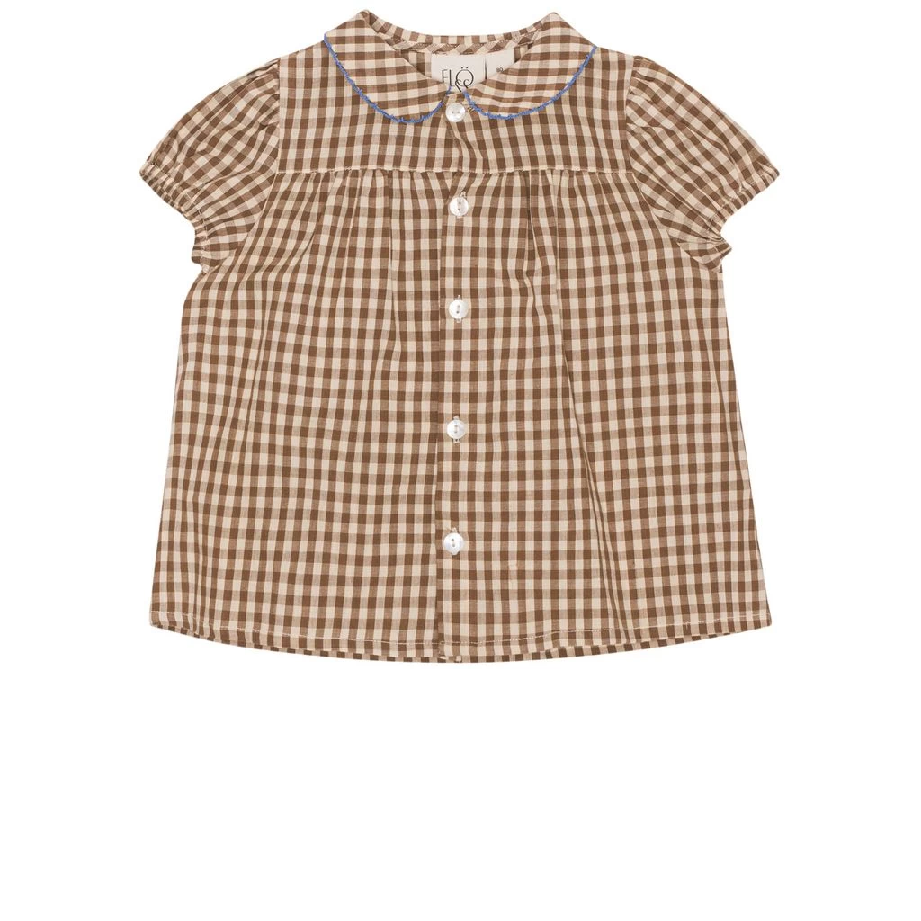 A simple, classic blouse that’s an essential piece of your wardrobe. Brown Bille blouse by Flöss. The blouse has a Peter Pan collar with picot trim. It has a button closure at the back and puff sleeves.