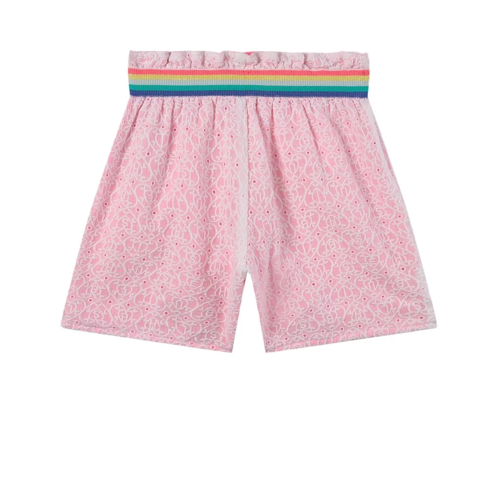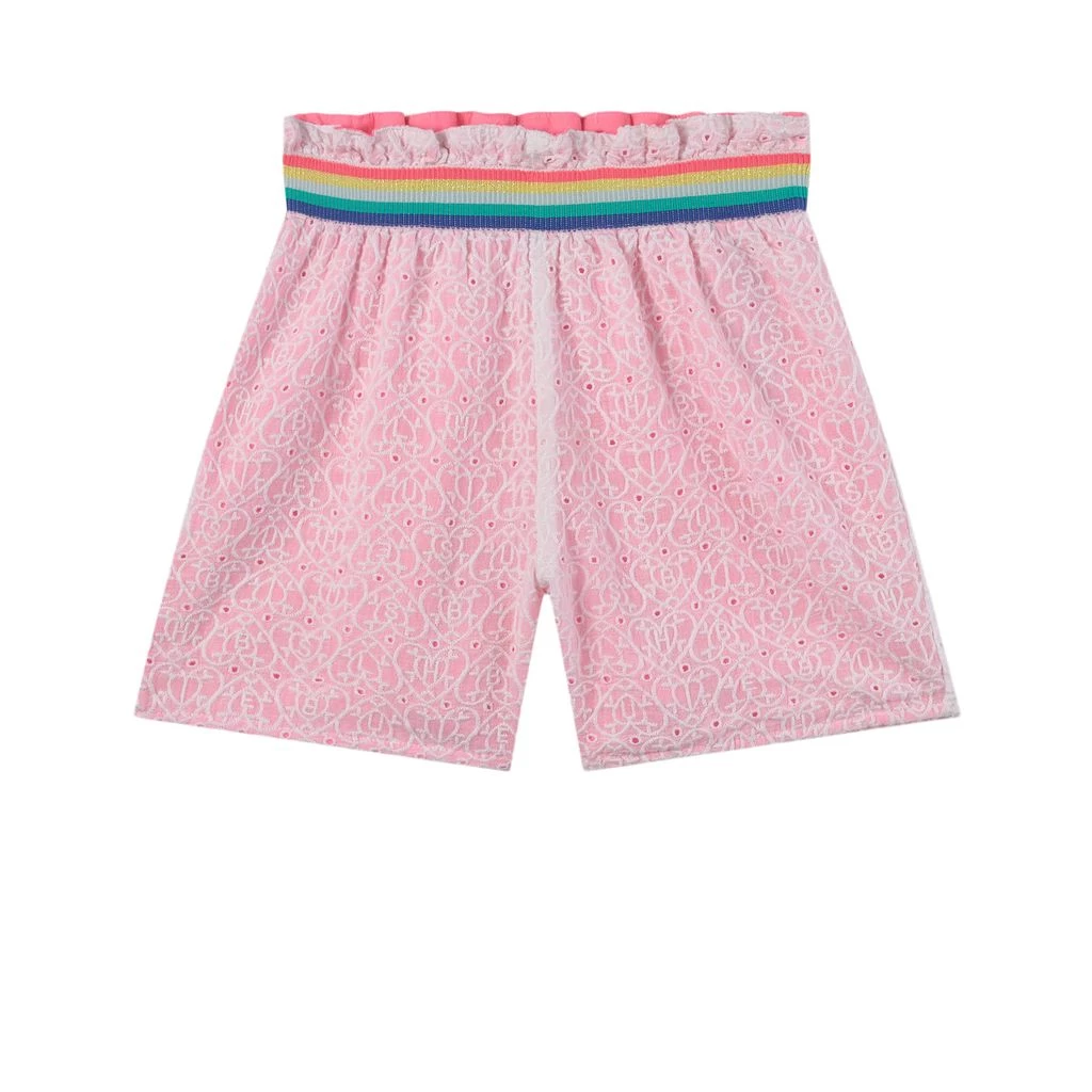 Pink shorts by Billieblush. The shorts have an embroidered pattern all over. They have soft lining and an elasticated waist.