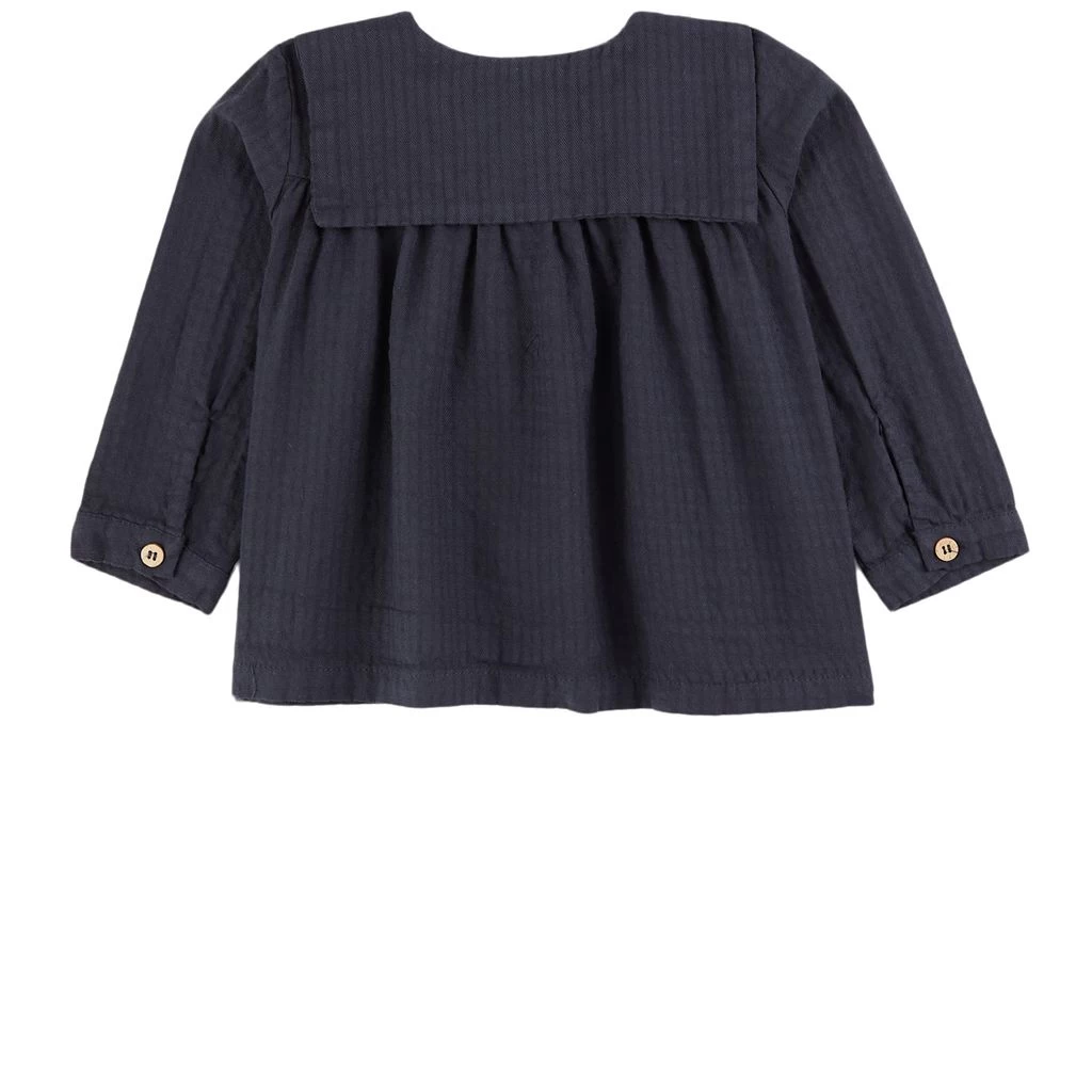 A basic you can’t go wrong with. Navy blouse by 1+ In The Family. The blouse has a button closure at the front. It has a pointed collar and button cuffs.