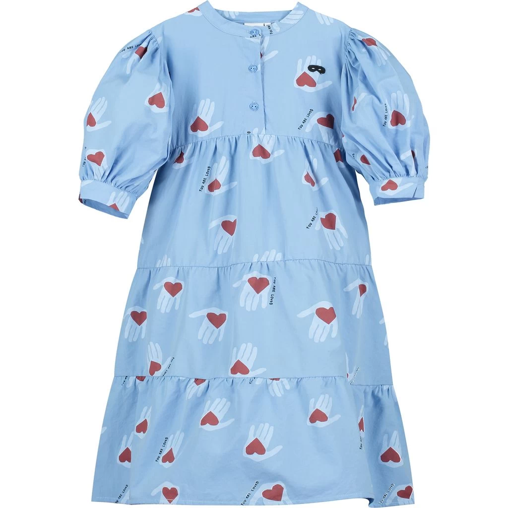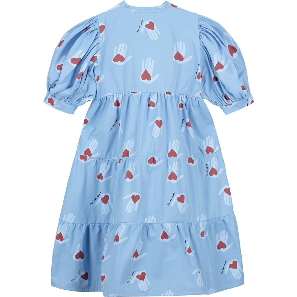 Blue Blue Hold My Heart dress by Beau Loves. The dress is made in Portugal and has a button closure at the front. It has puff sleeves and a tiered design.