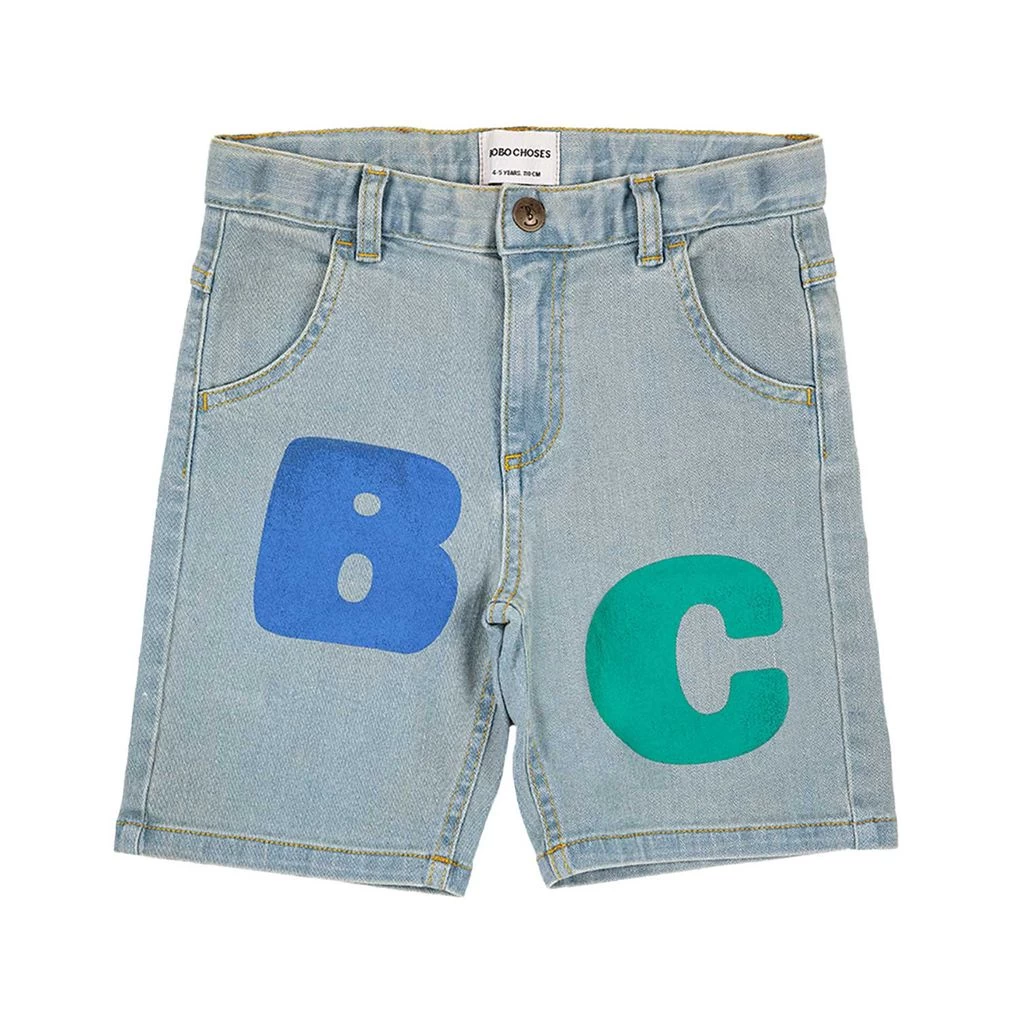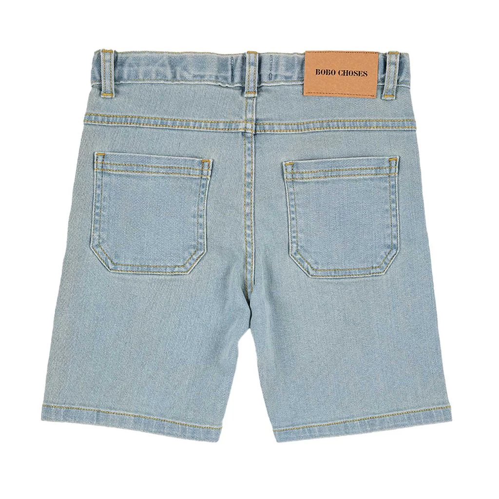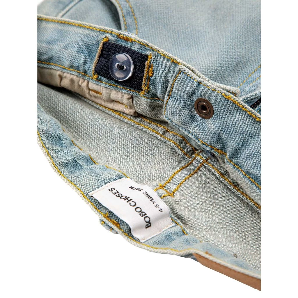 Perfect for those sunny days. Blue B.C denim shorts by Bobo Choses. The shorts have an adjustable button-elastic waist. They have a zip fly with snap button, two front pockets and two back pockets.