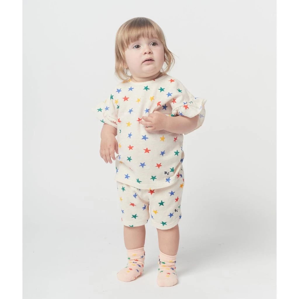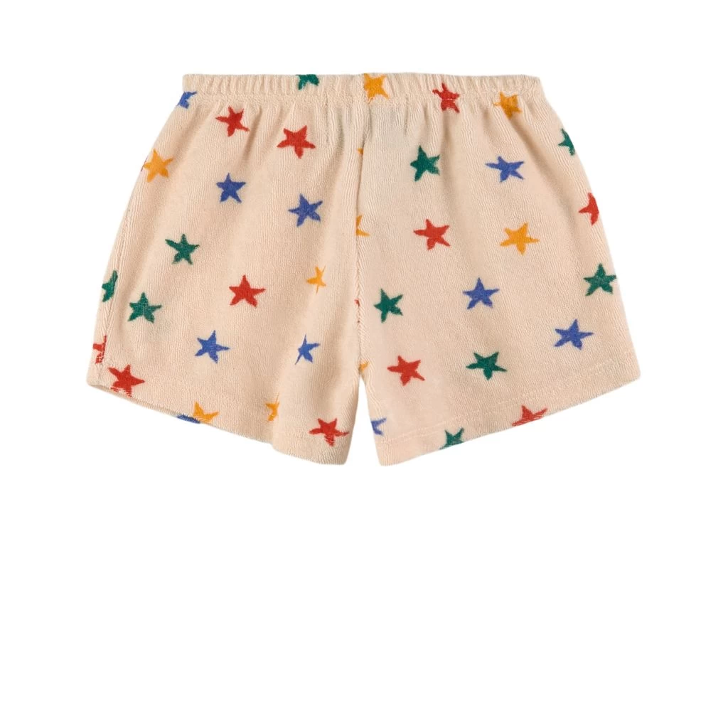 Sunny days will be even more fun. Cream shorts by Bobo Choses. The shorts have a soft terry material. They have a star print and an elasticated waist.
