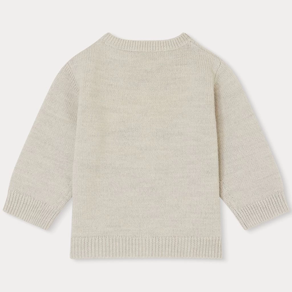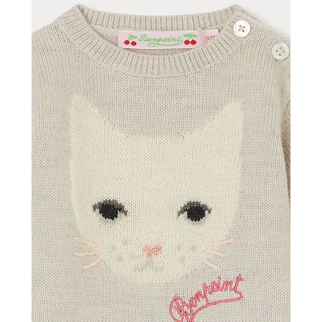 Your little baby will love the soft knitted feel. Grey Almire knit jumper by Bonpoint. The jumper has a knitted design. It has a button closure at the shoulder, an intarsia cat at the front and rib-knit cuffs.