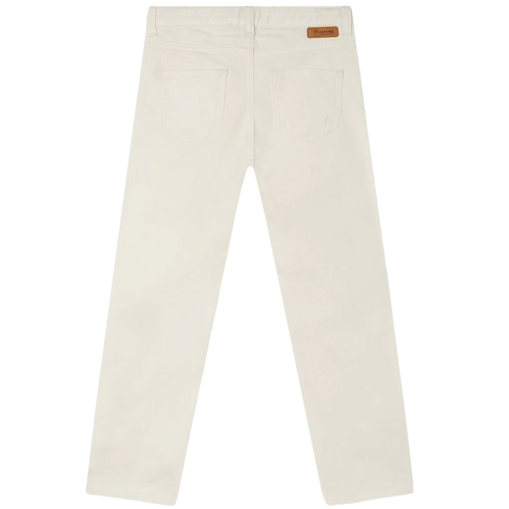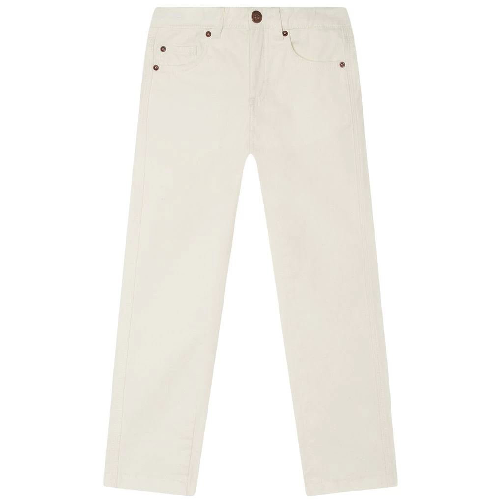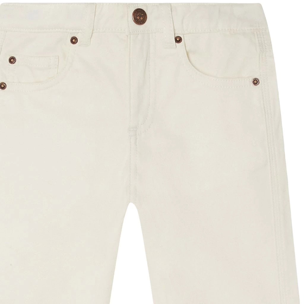 A new pair of jeans that’s both classic and stylish. White Bonnie jeans by Bonpoint. The jeans have a slim fit. They have an adjustable button-elastic waist, a zip fly with hook closure and a 5-pocket design.