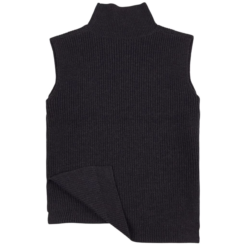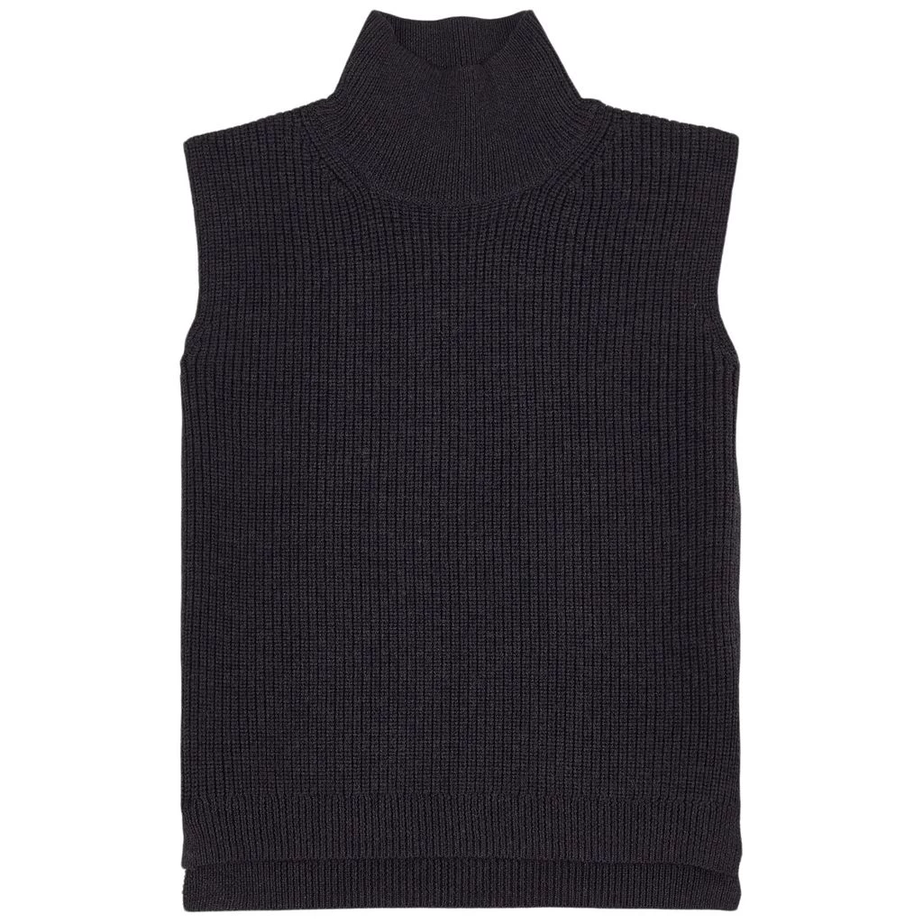 A comfortable sweater that’s perfect to keep you warm during winter. Navy Bouchra jumper by Bonpoint. The jumper has a sleeveless, rib-knit design. It has a high collar and a tennis tail.
