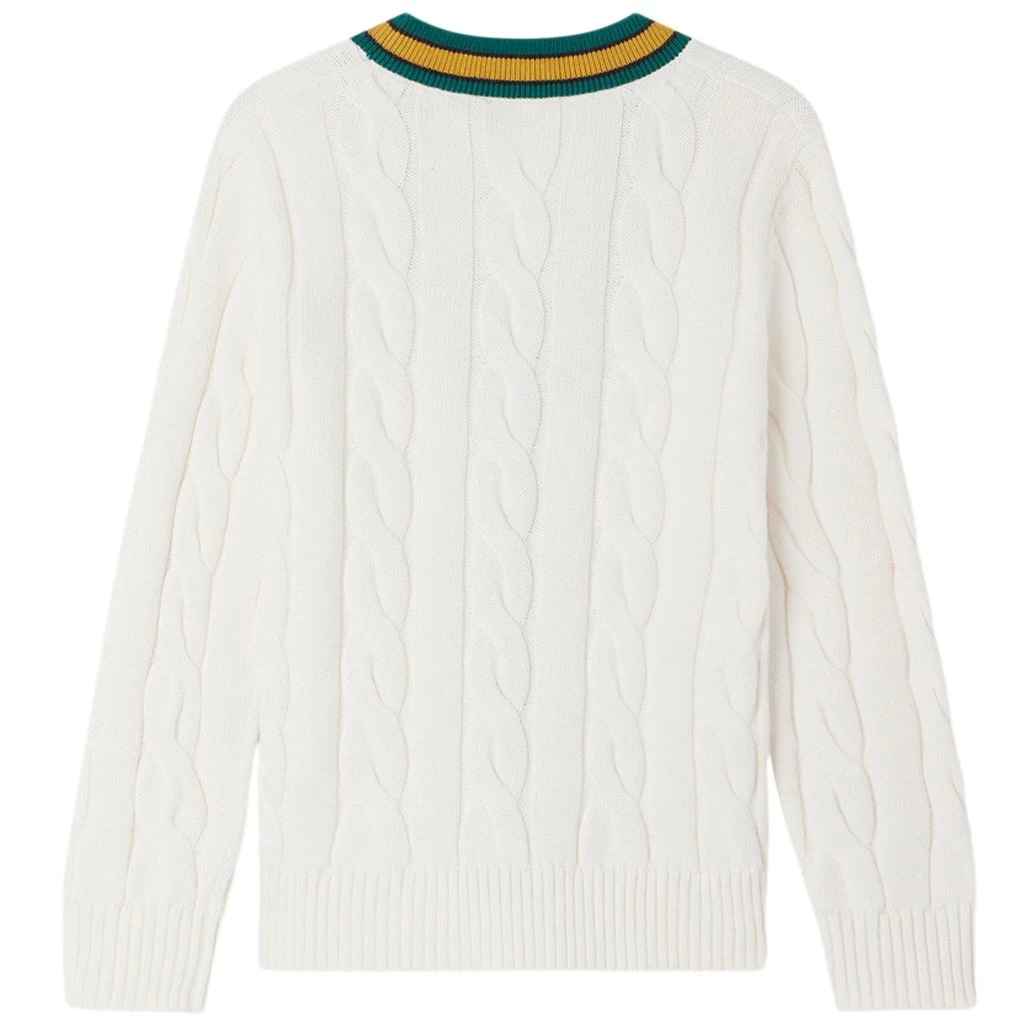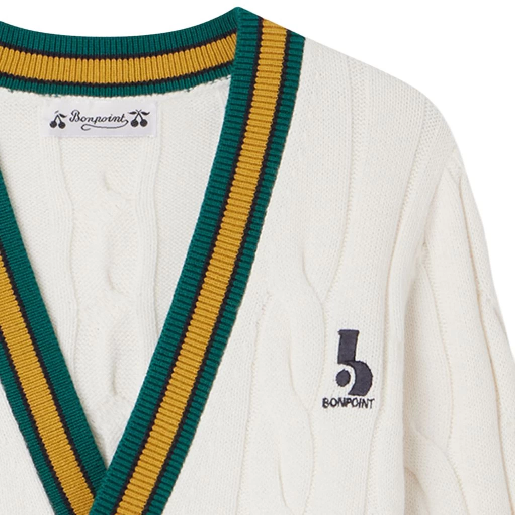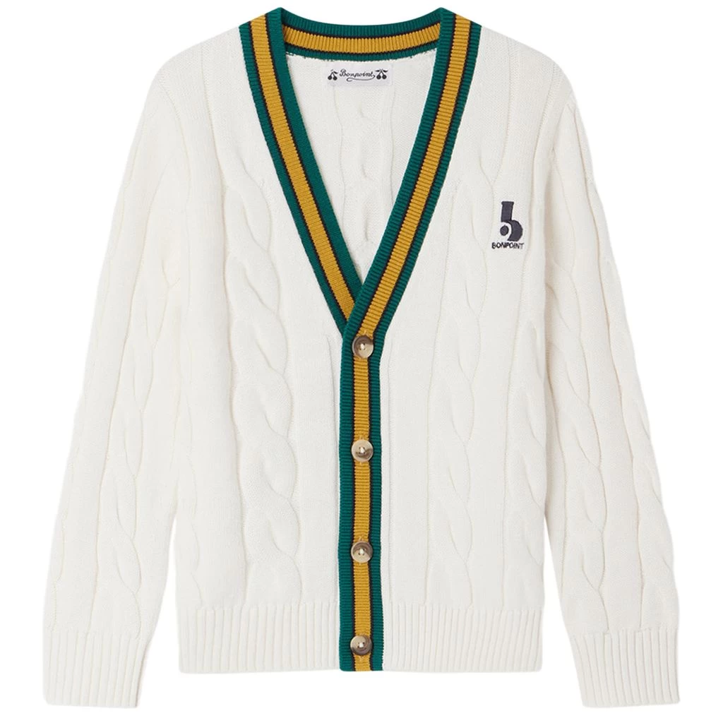 A soft cardigan with a striking design. Cream Dalvin cardigan by Bonpoint. The cardigan has a cable knit design. It has a button closure at the front and rib-knit cuffs.