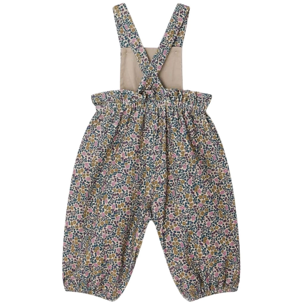 Dress up for special occasions. Multicolor overalls by Bonpoint. The overalls have a floral all-over print. They have criss crossed shoulder straps with buttons and an elasticated waist.