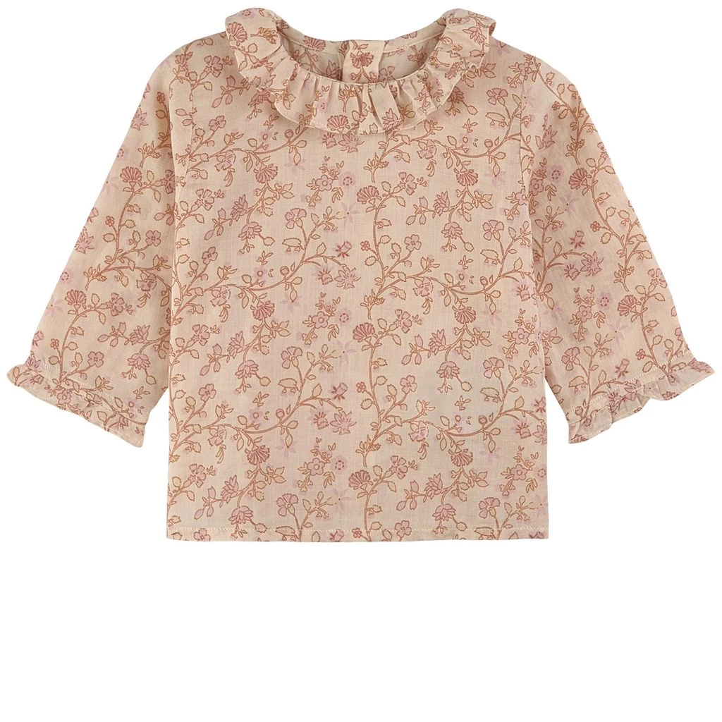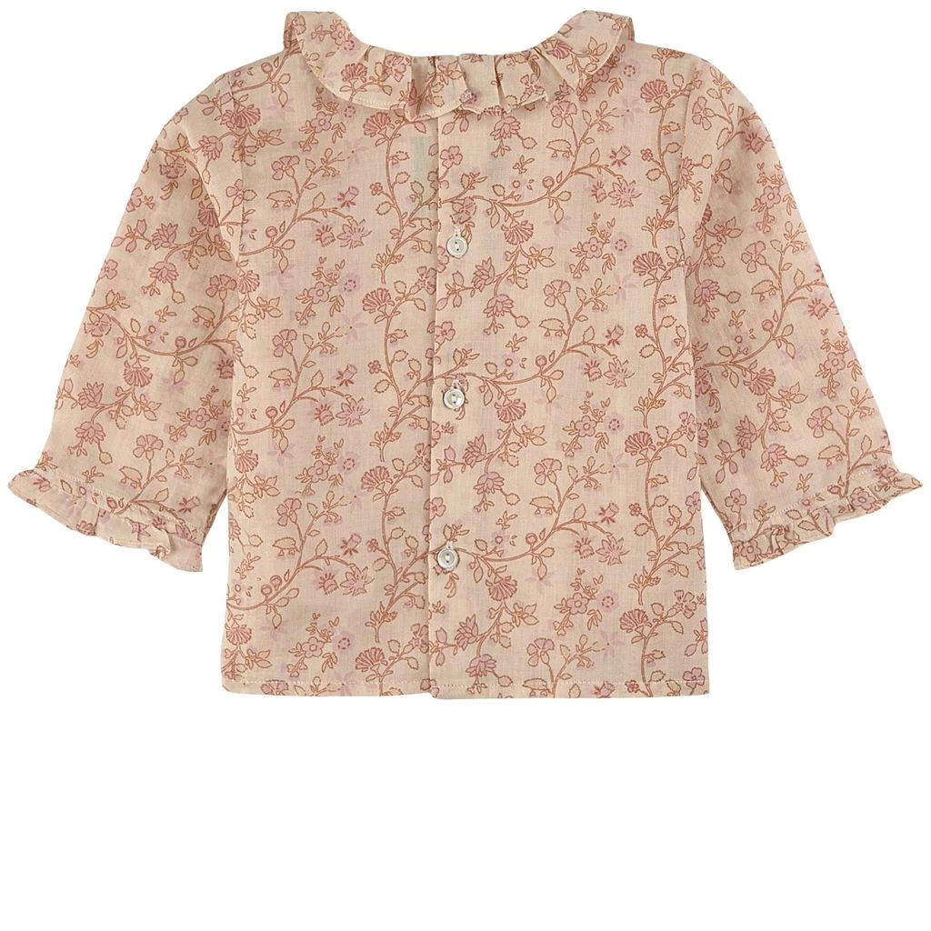 A cute and stylish look. Rose Ganiti blouse by Bonpoint. The blouse has a ruffled rounded collar. It has a floral all-over print, ruffled cuffs and a button closure at the back.