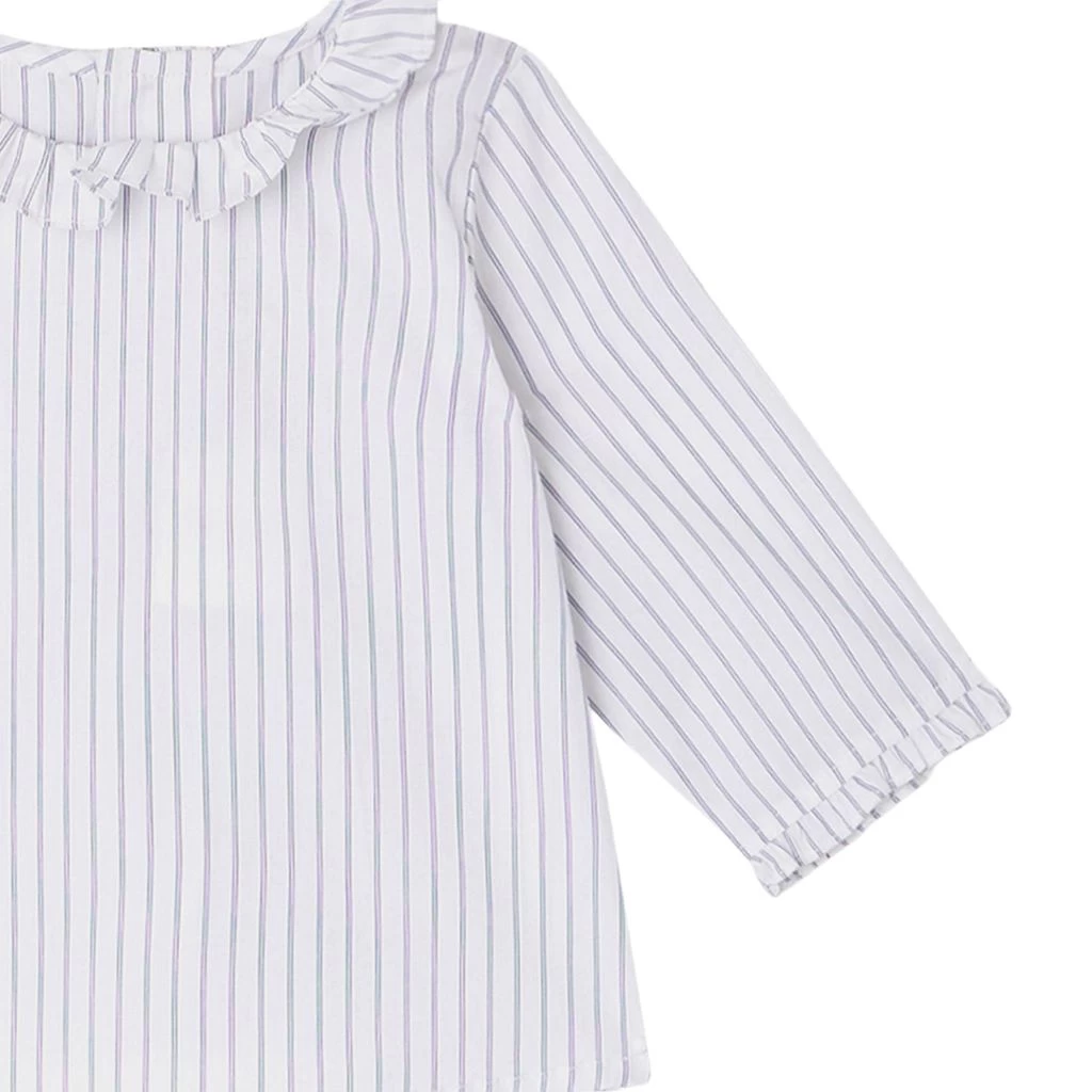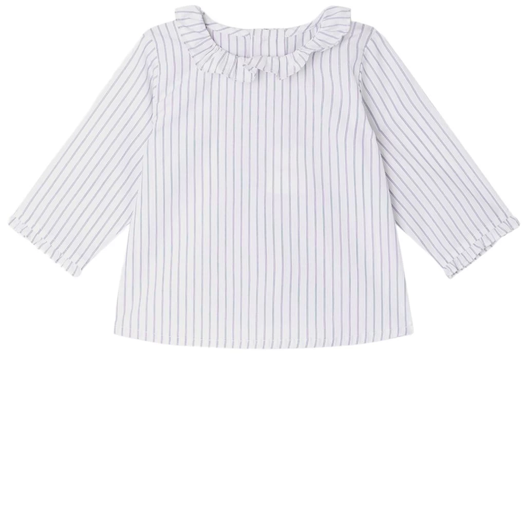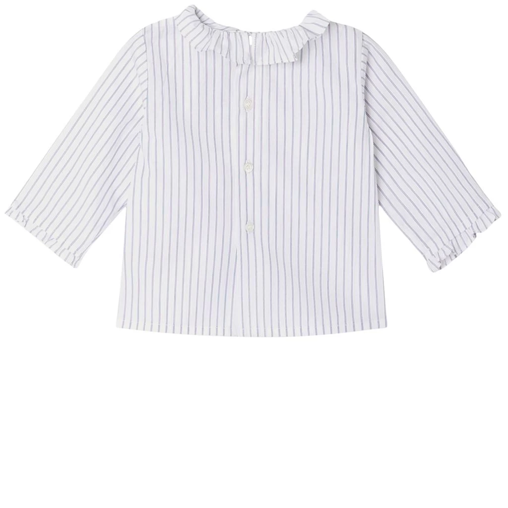 A simple, classic blouse that’s an essential piece of your wardrobe. White Ganiti blouse by Bonpoint. The blouse has a ruffled rounded collar. It has a striped design, ruffled cuffs and a button closure at the back.