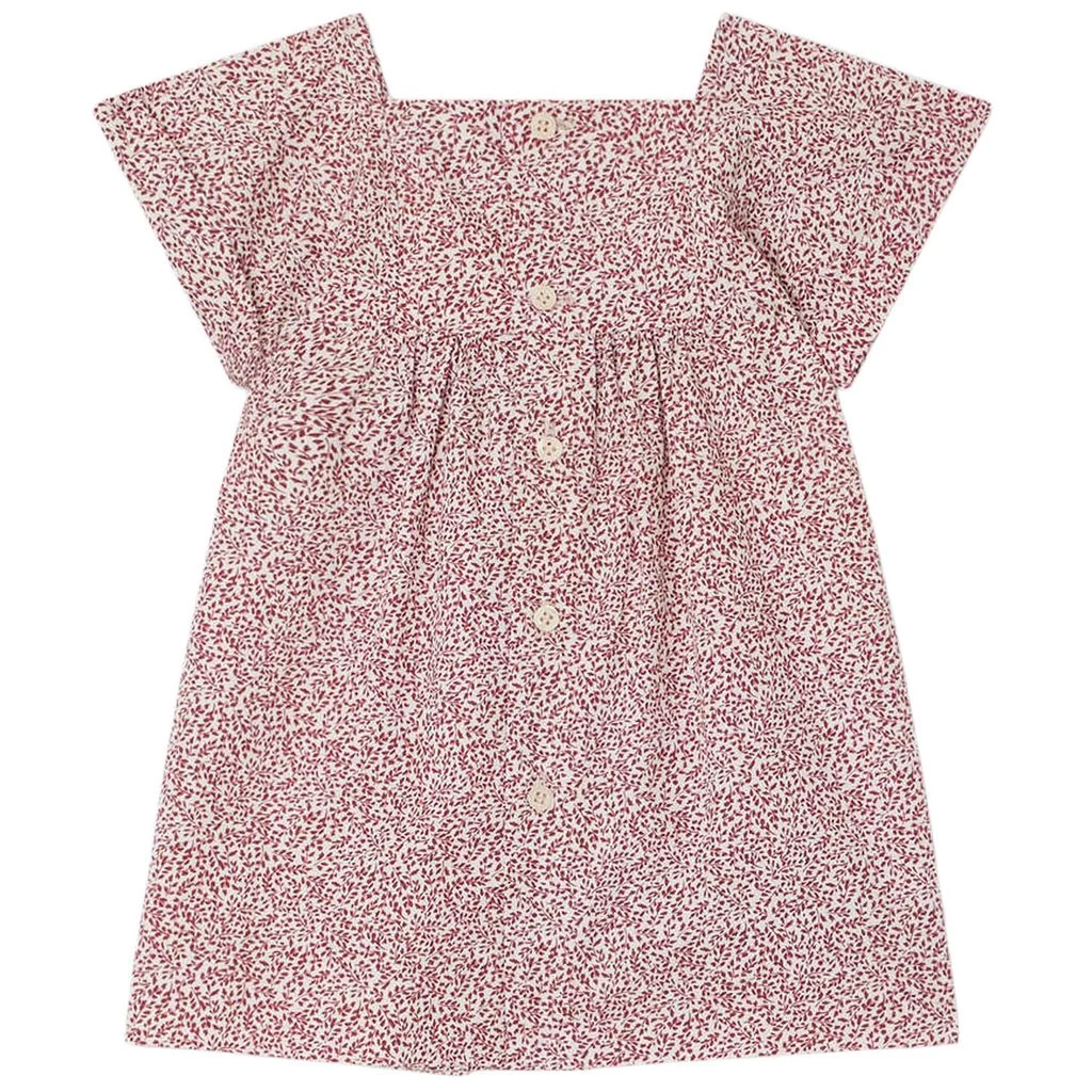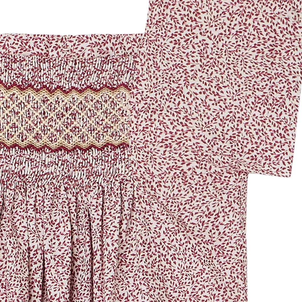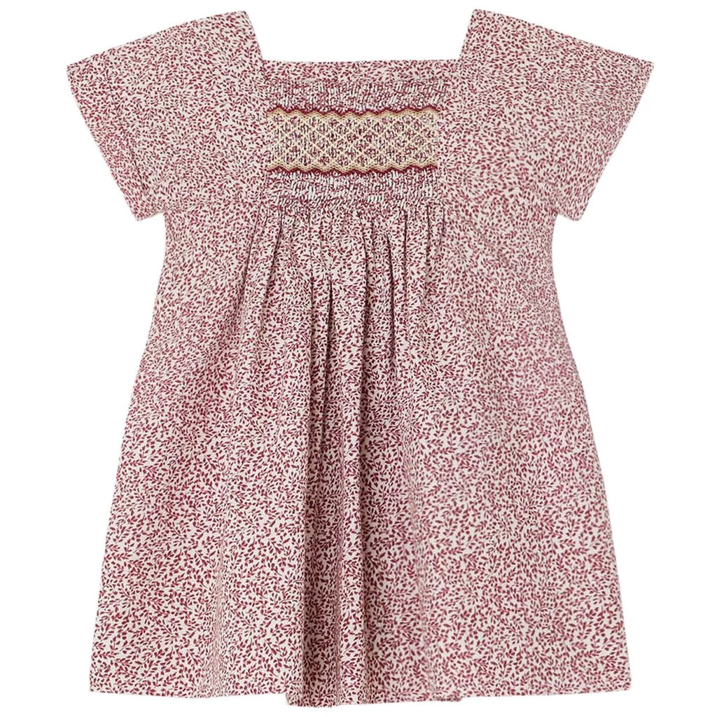 A dress for every occasion. Cream, red Pais dress by Bonpoint. The dress has an all-over print with cherries. It has an A-line silhouette, a button closure at the back and smock details at the front.
