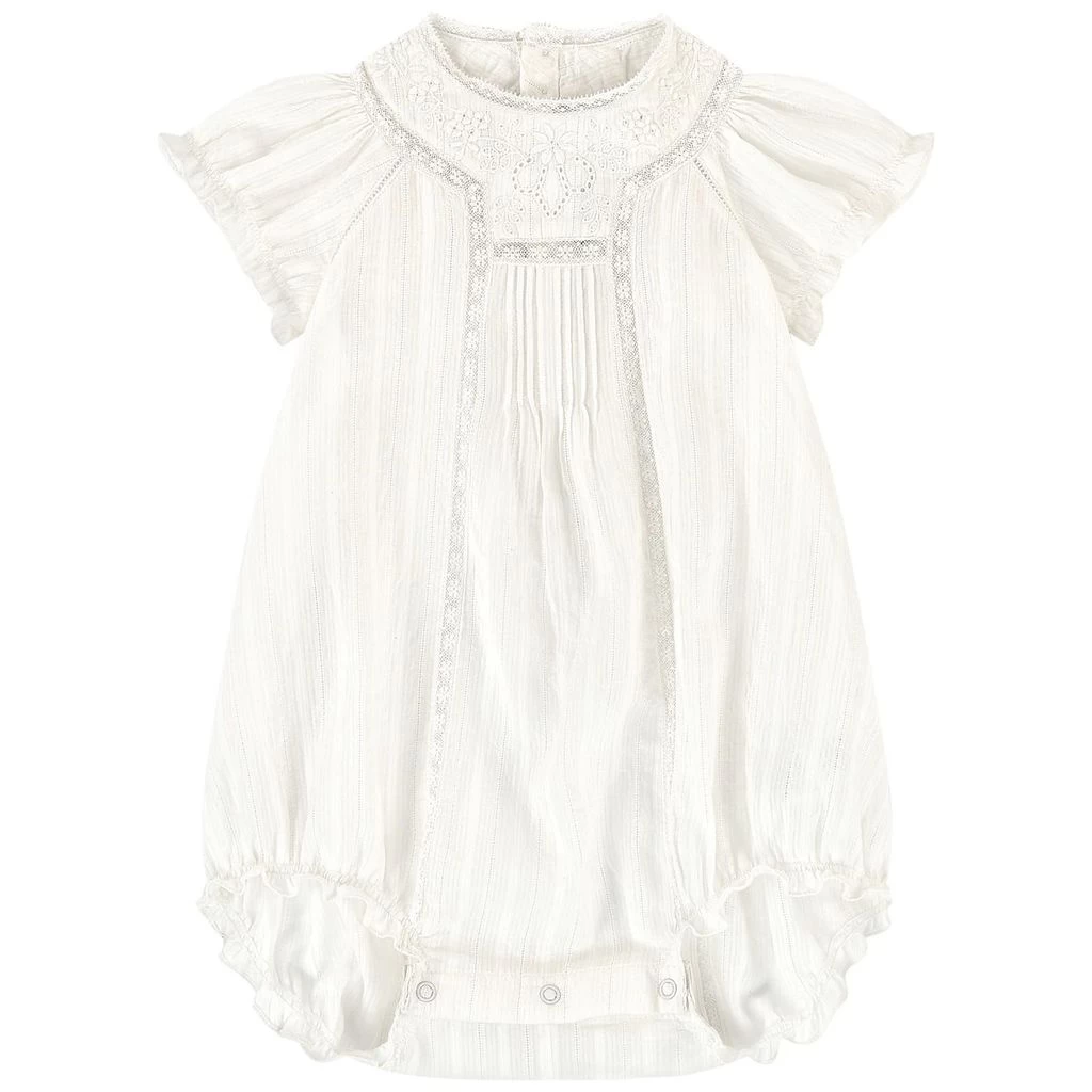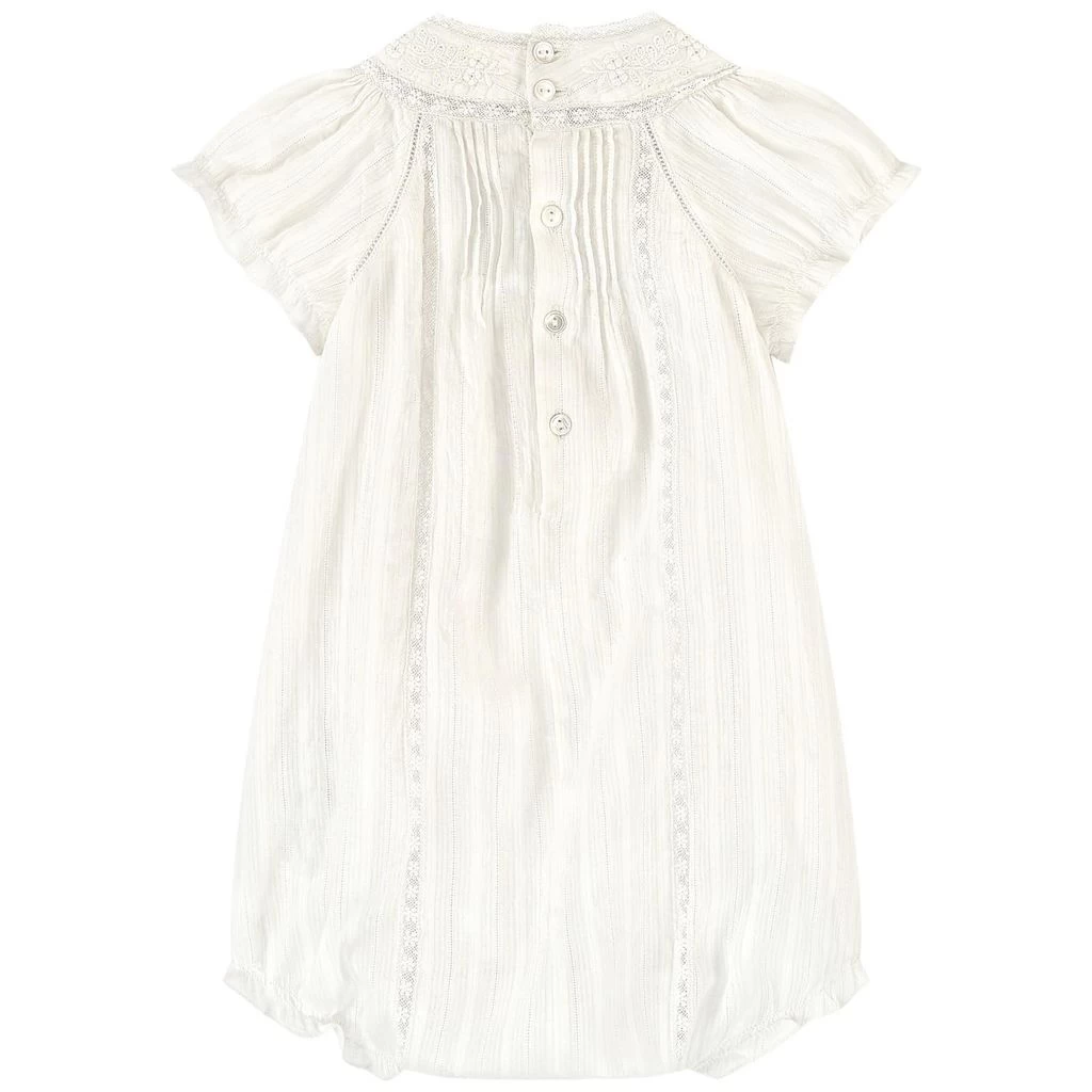 White Voile romper by Bonpoint. The romper has a button closure at the back. It has a snap button closure between the legs, an embroidery detail on both sides and a flounced detail on the sleeves and at the cuffs.