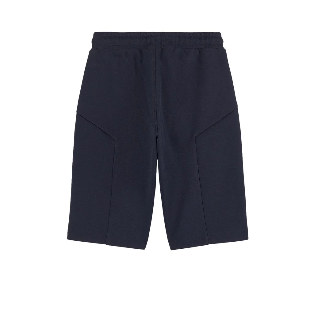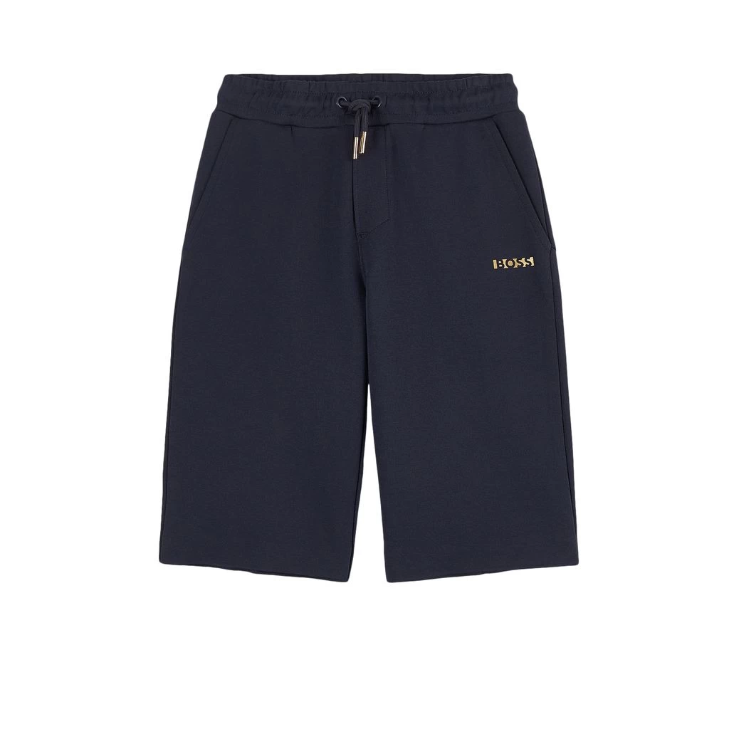 Navy Logo shorts by BOSS. The shorts have an elasticated drawstring waist. They have a logo print at the front, a faux fly and slanted front pockets.