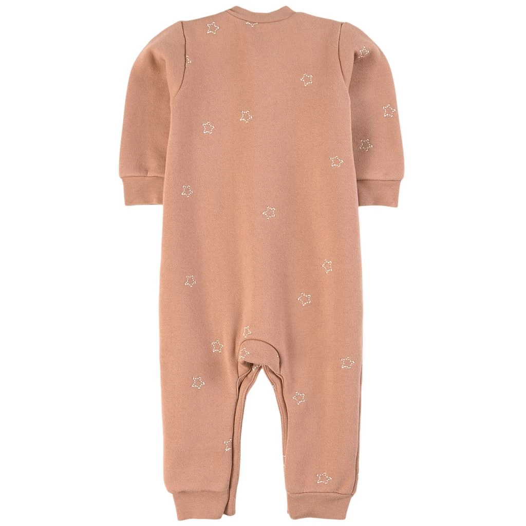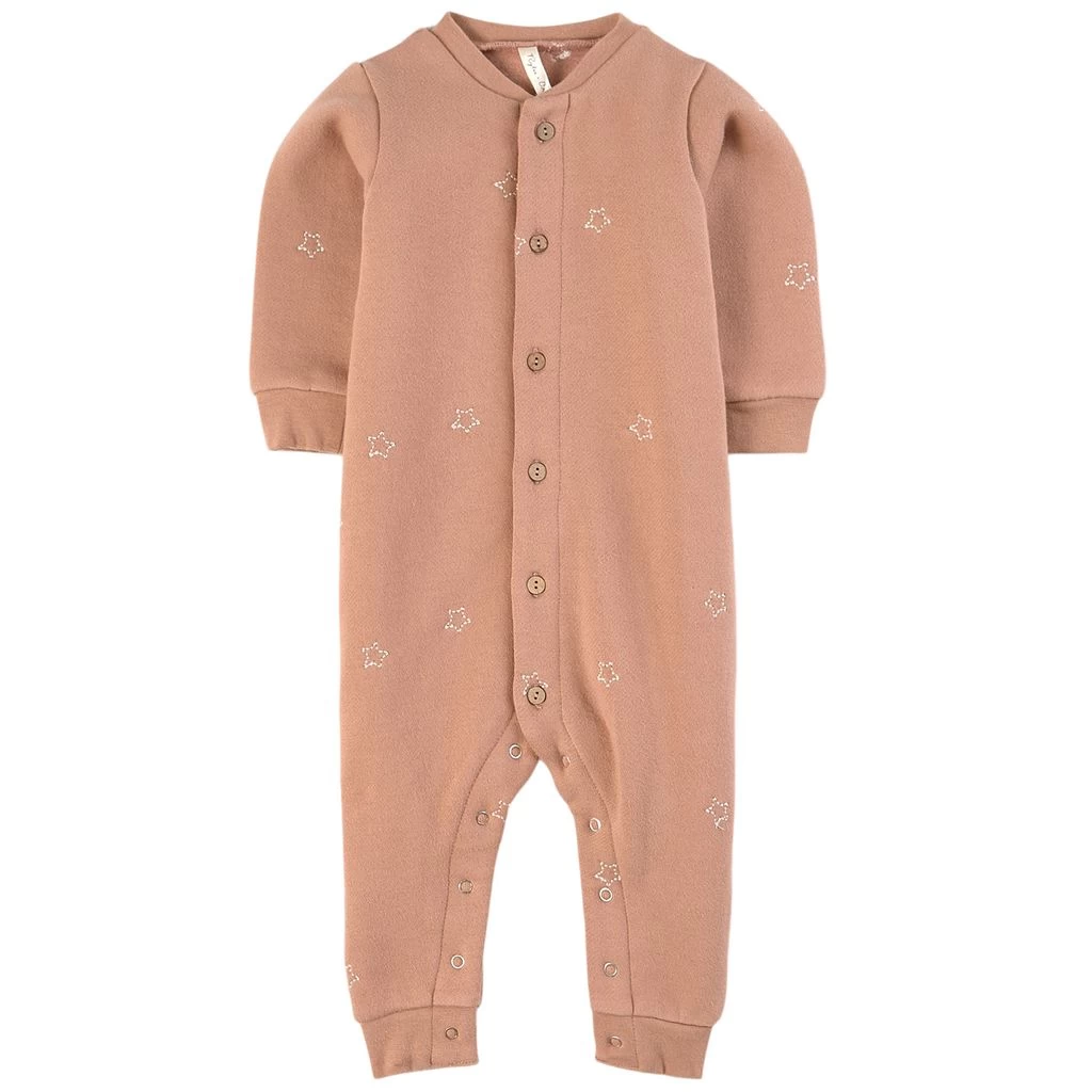 Beige Button-Down onesie by Rylee + Cru. The onesie has embroidered details throughout. It has a button closure at the front and snap buttons between the legs.