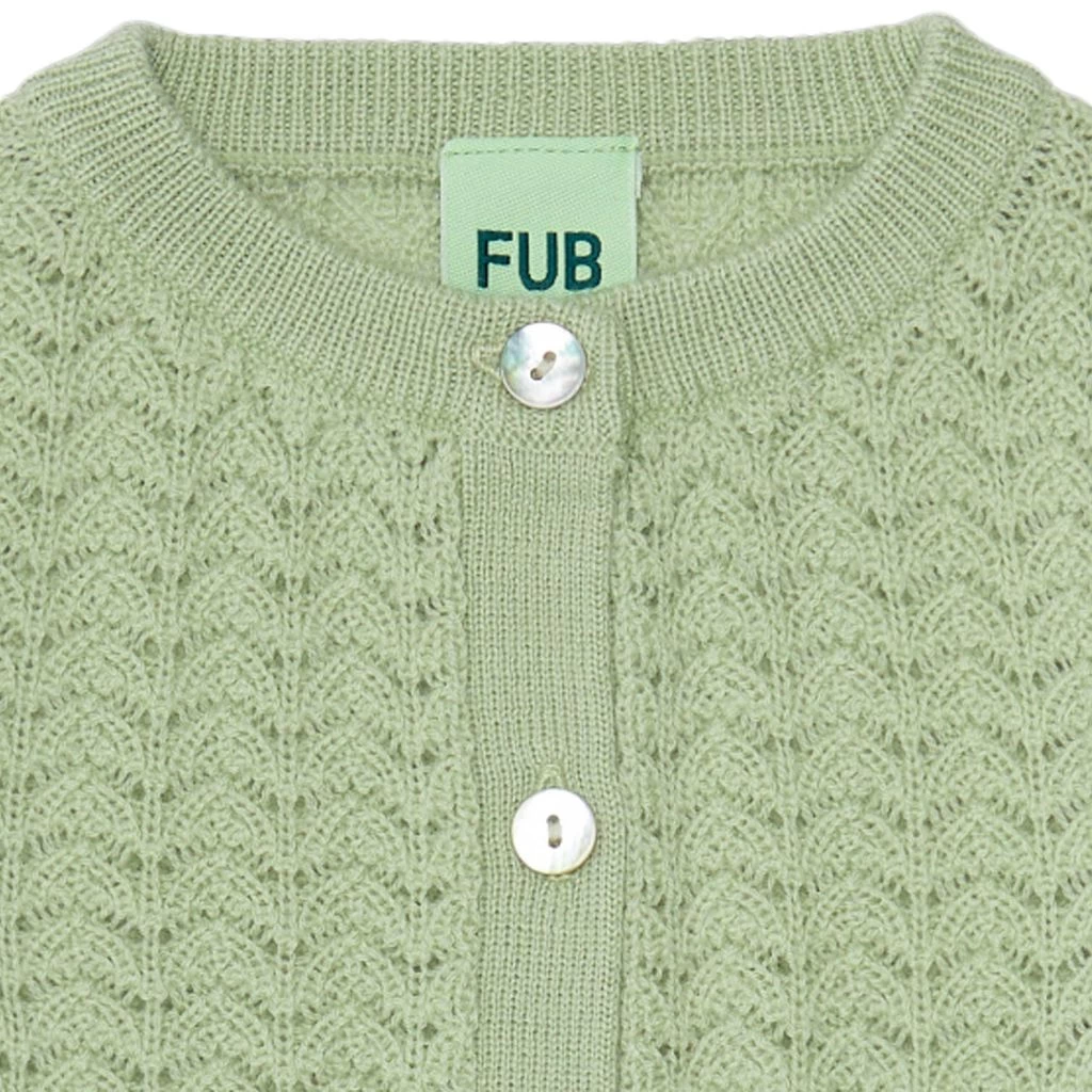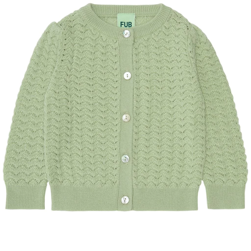 A nice and soft cardigan for your baby. Green cardigan by FUB. The cardigan has a knitted design. It has pointelle detailing, a button closure at the front and rib-knit cuffs.