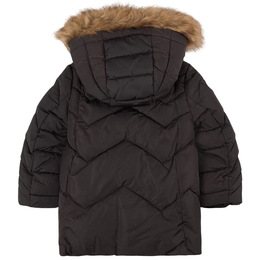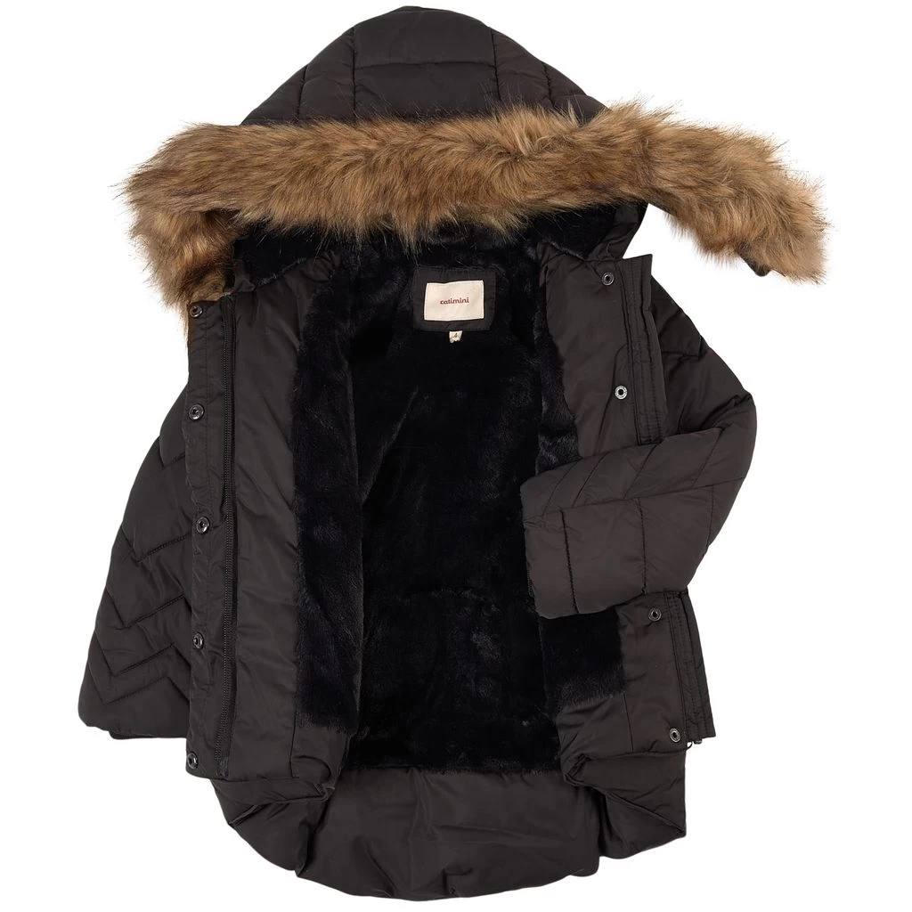 Black puffer jacket by Catimini. The jacket has a zip closure at the front with a stormflap. It has two slanted zip pockets at the front, a high-low hem, a fixed hood with removable faux fur trim and warm teddy lining.