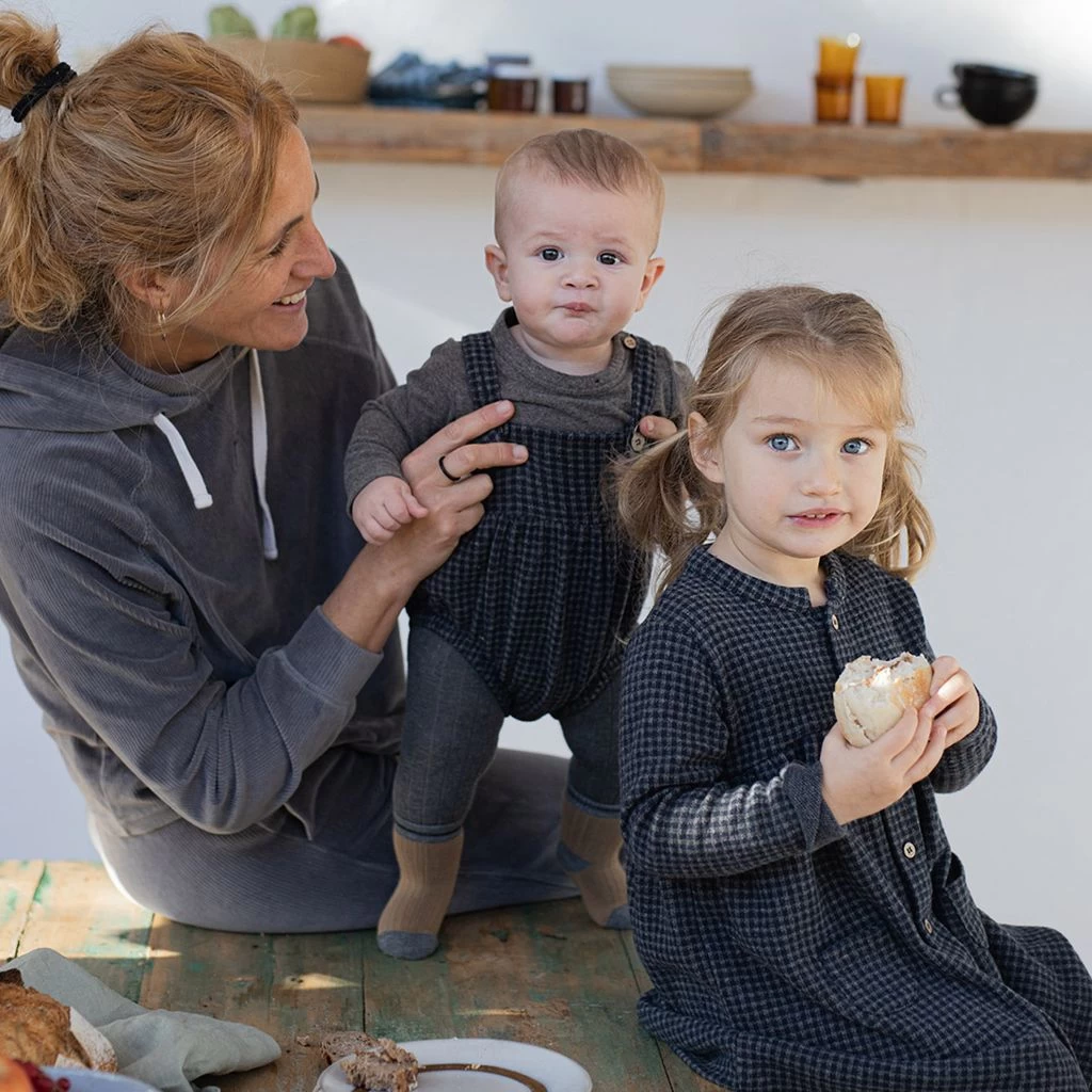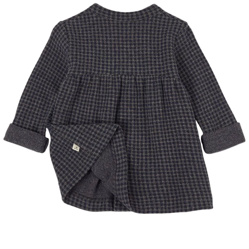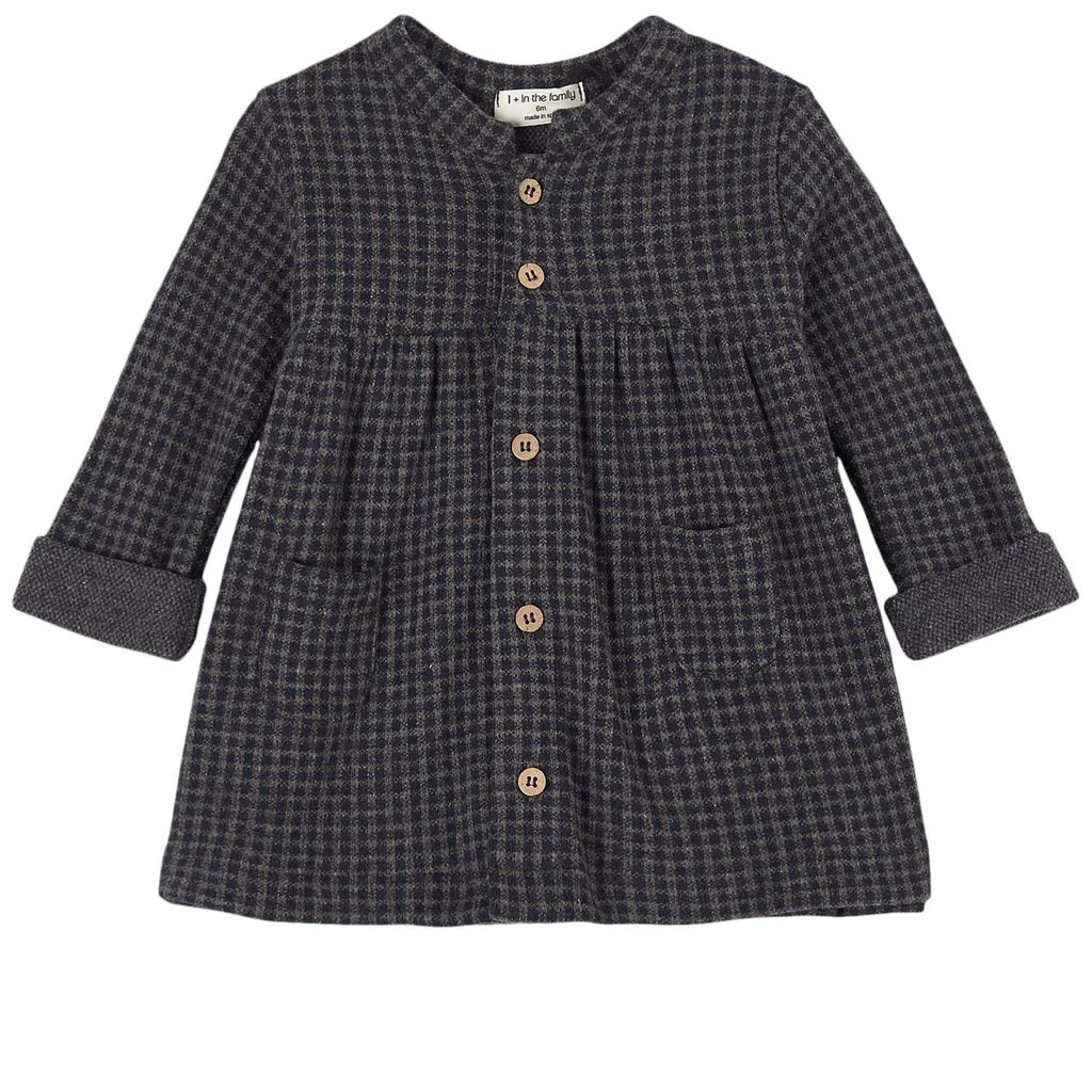 A dress for every occasion. Navy dress by 1+ In The Family. The dress has a checked pattern. It has an A-line silhouette, an empire waist, a button closure at the front, two front pockets and folded cuffs.