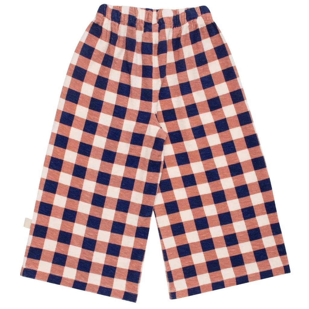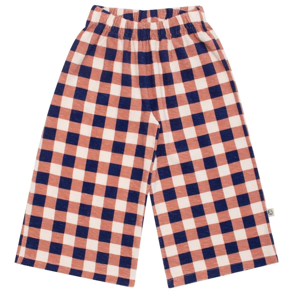 A funky pair of pants that have a touch of color. Your kids will love these!. Navy trousers by Wynken. The trousers have an elasticated waist. They have two front pockets and wide, cropped legs.