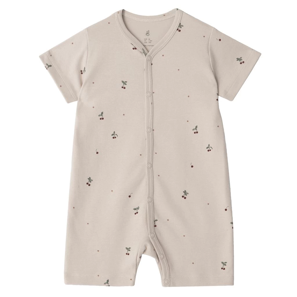 Let your baby explore and play in comfort. Cherry romper by Garbo&Friends. The romper has snap buttons at the front and down the leg.