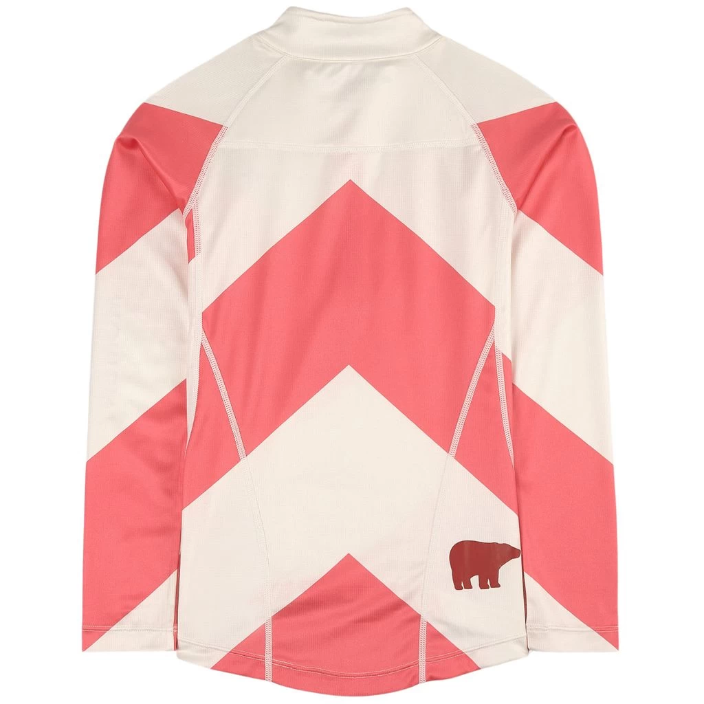 Pink, cream Chevron baselayer top by Perfect Moment. The baselayer top has flatlock seams. It has a high neck and a half-length zip closure at the front.
