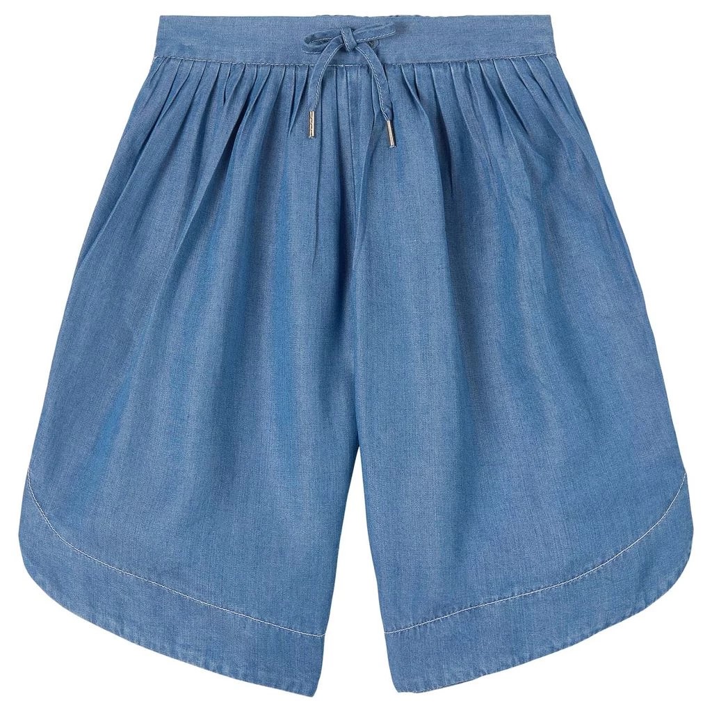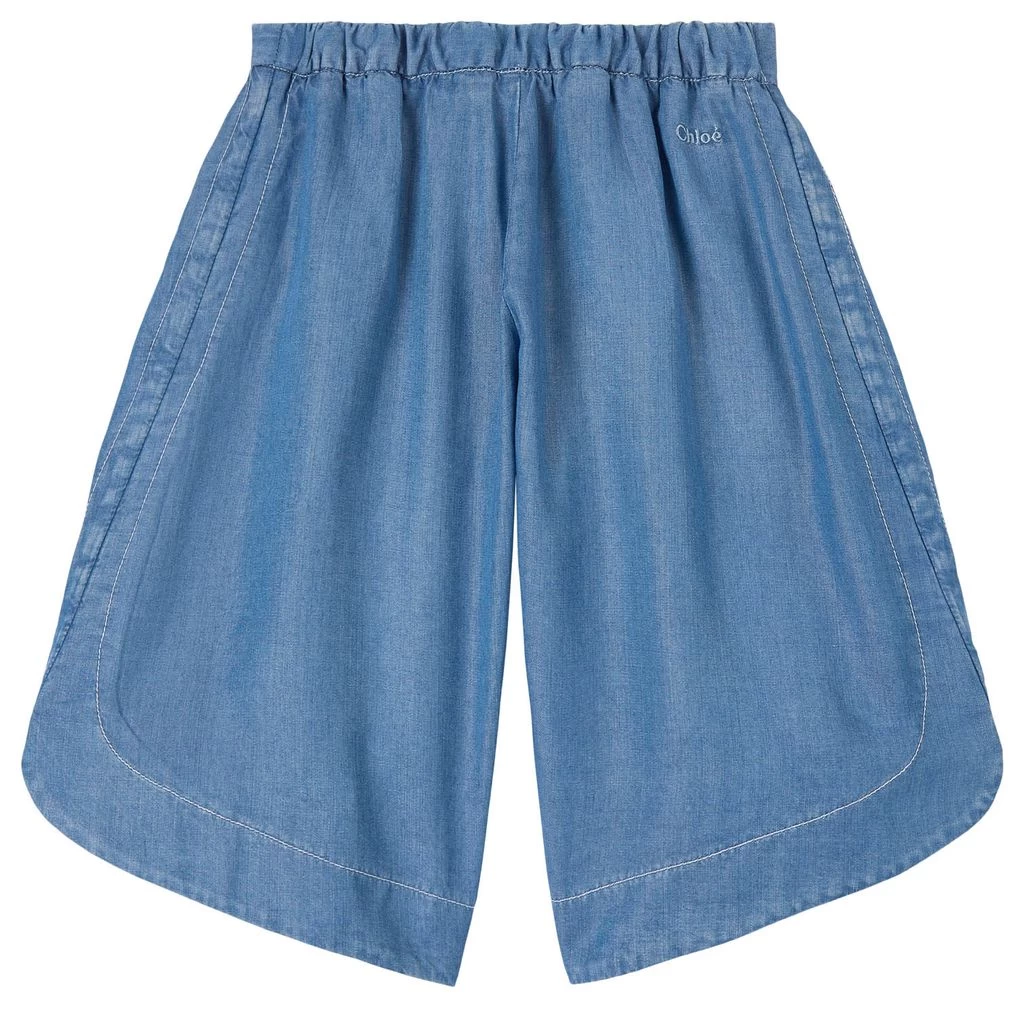 Blue Chambray trousers by Chloé. The trousers have bow detailing at the front. They have a loose fit, an embroidered logo on the back, a semi-elasticated waist and a pleating at the front.