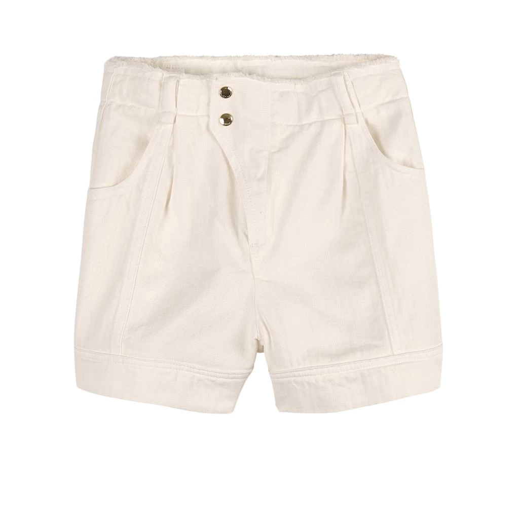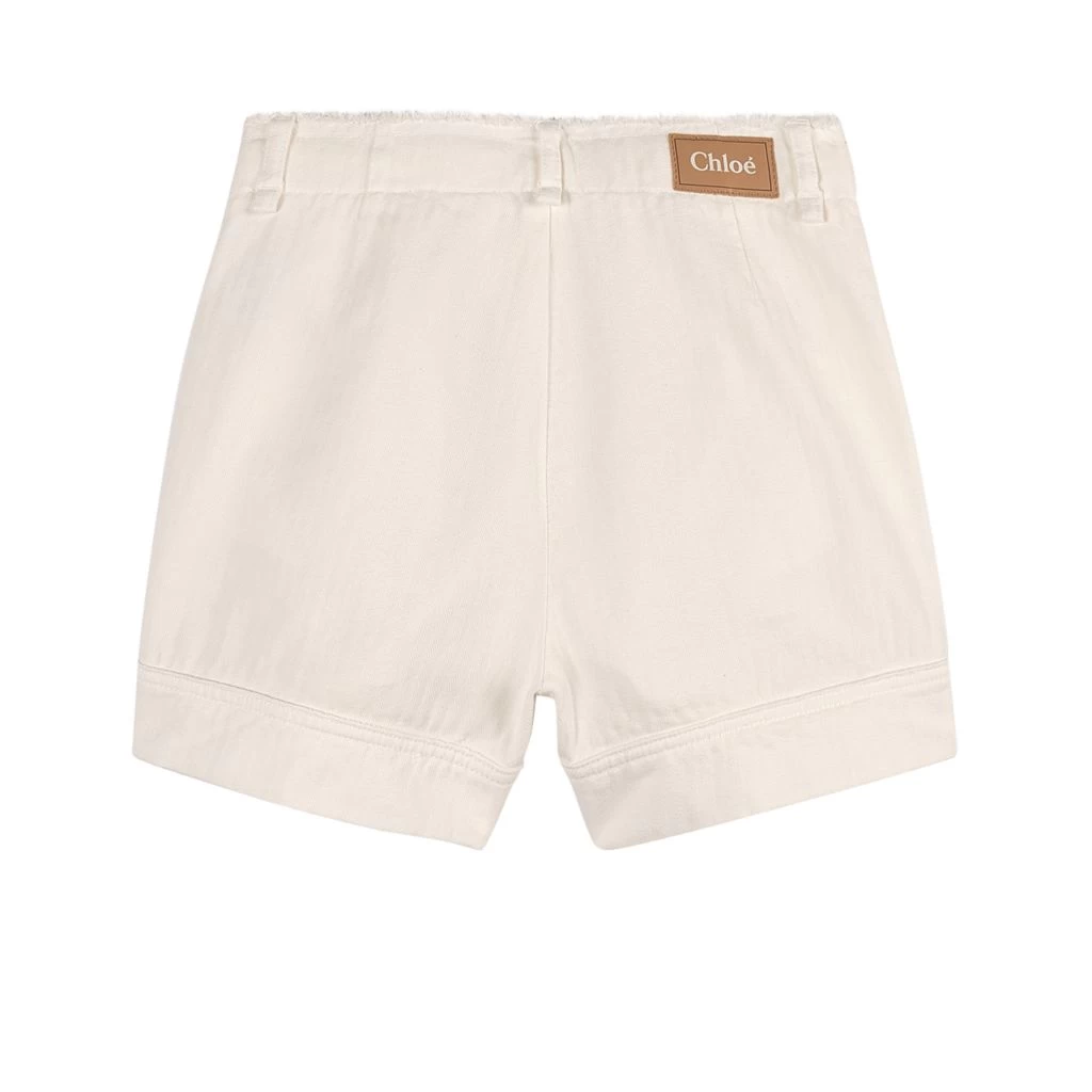 White denim shorts by Chloé. The denim shorts have an adjustable button-elastic waist with raw edges. They have a zip fly with snap buttons and two front pockets.