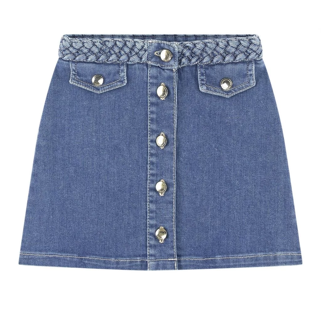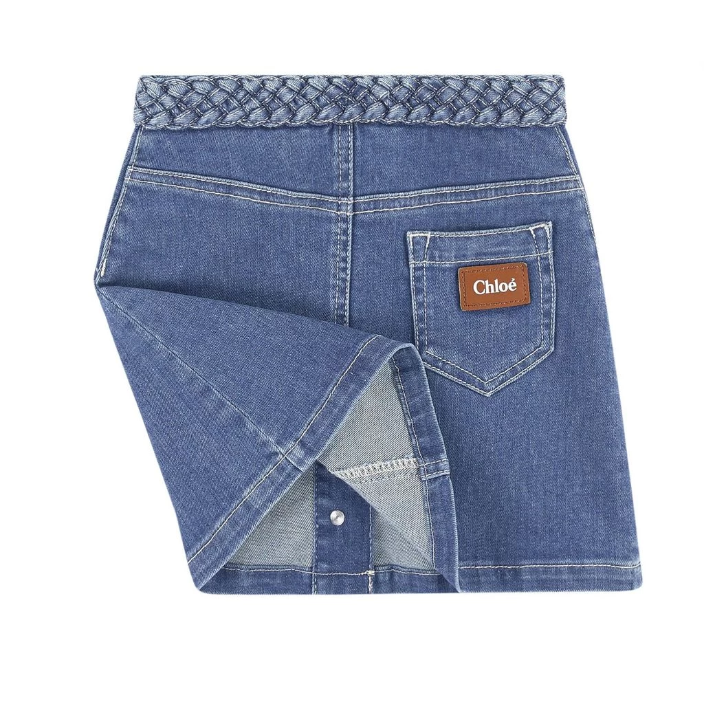 Jupe Mini Me denim skirt by Chloé. The skirt has a button closure at the front. It has an adjustable button-elastic waist, faux pockets at the front, two back pockets and a logo detail at the back.