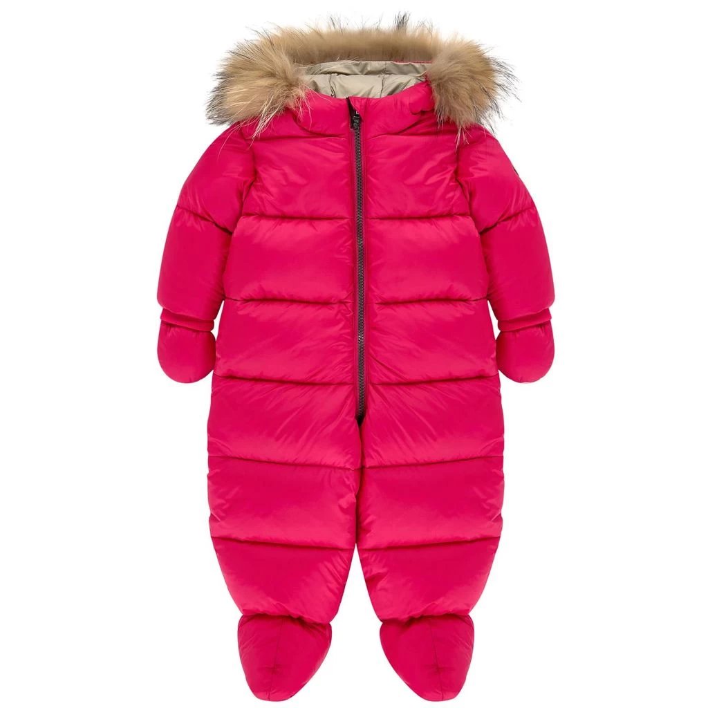 Waterproof waxed fabric on the outside, Genuine feather, Duck and feather padding, Warm item, Perfect to protect from the cold, Great item to keep baby warm on its first outings, Non-detachable hood, Removable fur, Gathered cuffs, Snap-fastened mittens, Footed legs, Zipper on the front