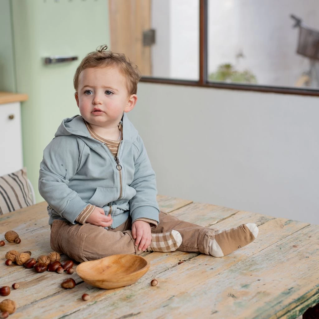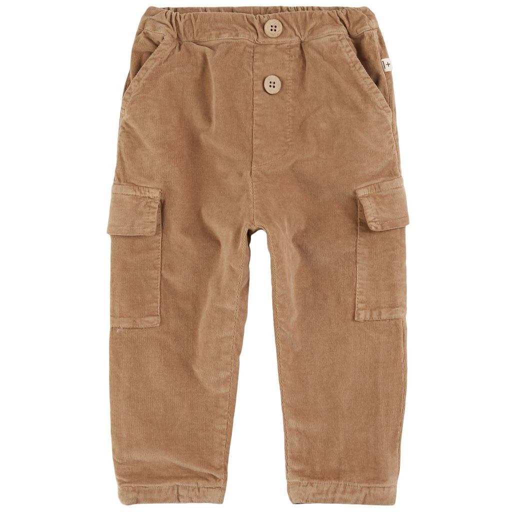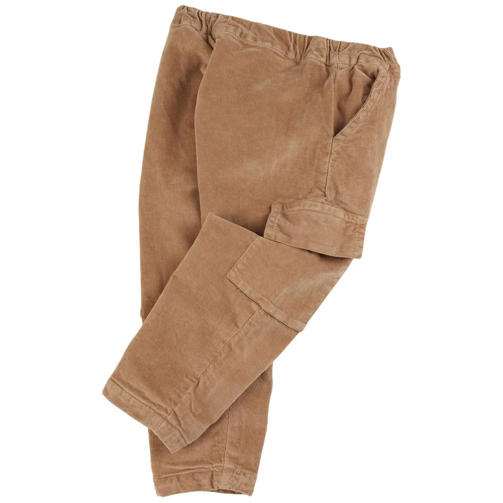 Beige corduroy trousers by 1+ In The Family. The corduroy trousers have an elasticated waist. They have two front pockets, two side pockets and a faux fly.