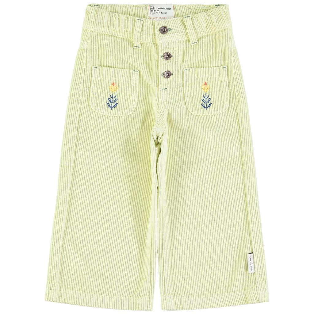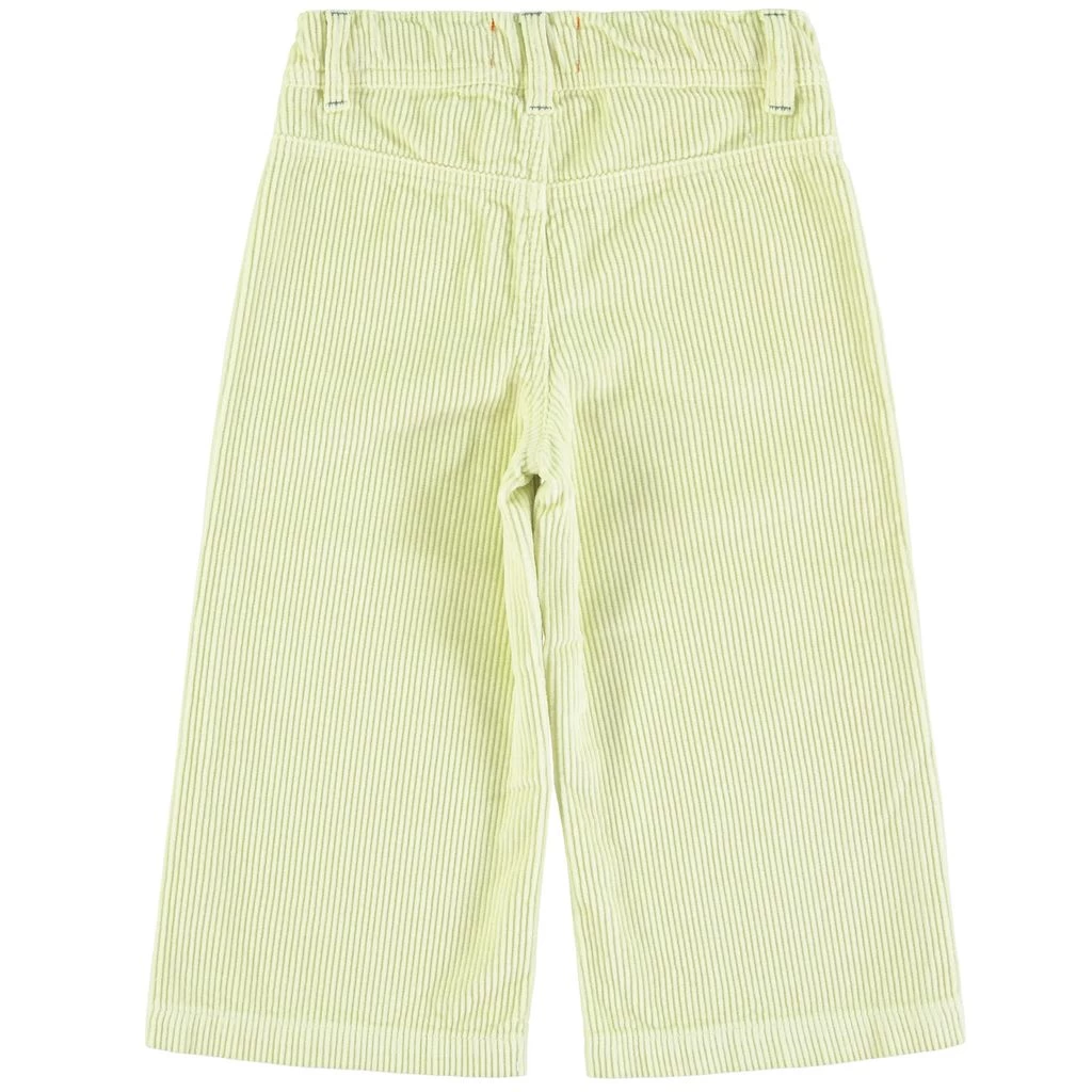 A funky pair of pants that have a touch of color. Your kids will love these!. Green corduroy trousers by Piupiuchick. The corduroy trousers are made in Portugal and have front pockets. They have a button closure at the front.