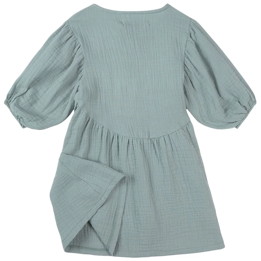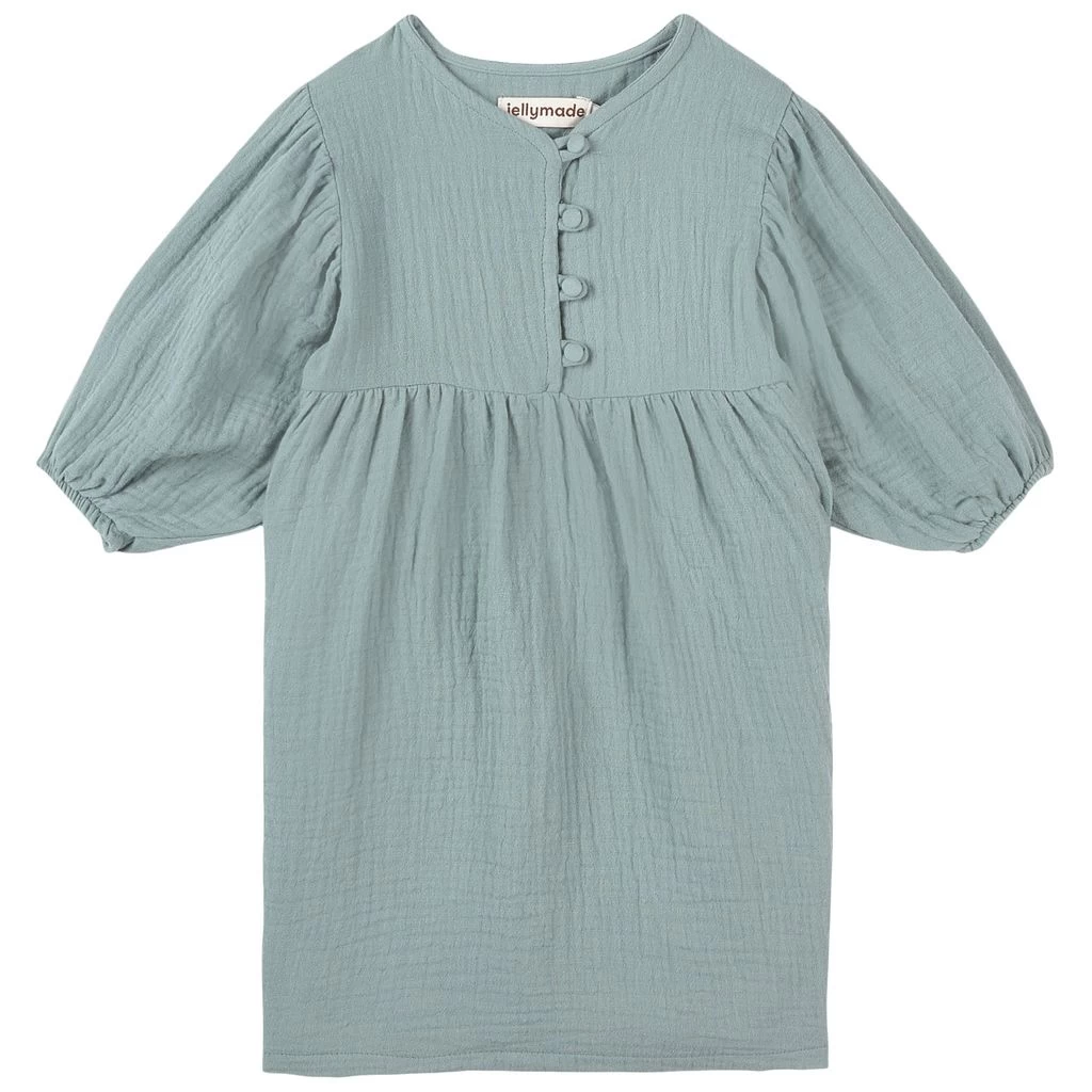 Blue Corie dress by Jellymade. The dress is made in Portugal and has a button closure at the front. It has puff sleeves and an elasticated cuff.