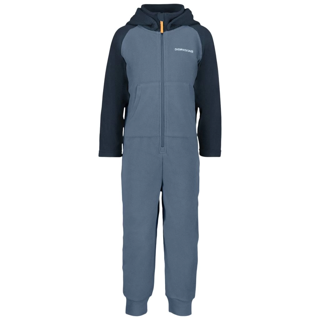 Keep warm with comfy fleece. Blue Monte Kids fleece coverall by Didriksons. The fleece coverall has a color-blocked design. It has a regular fit, a detachable hood, a zip closure at the front and two front pockets.