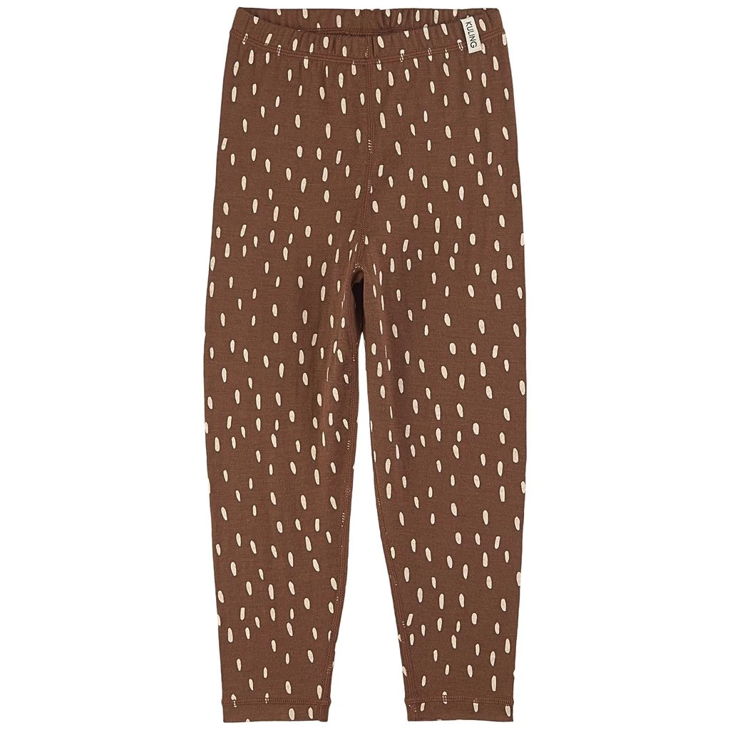 Keep little legs comfy. Brown baselayer pants by Kuling. The baselayer pants have an elasticated waist.