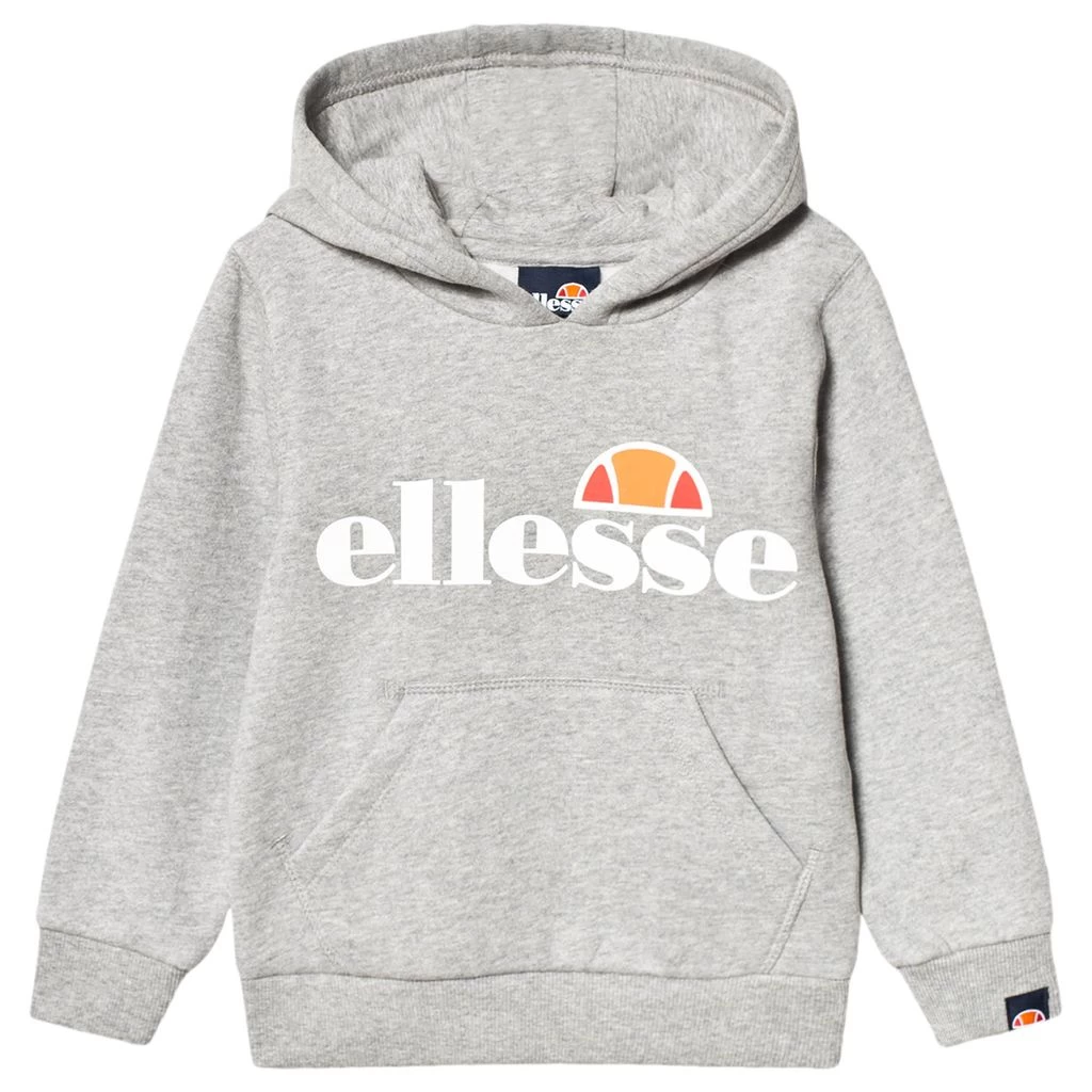 Grey melange Jero hoodie by Ellesse. The hoodie has a logo print at the front. It has a fixed hood, a split kangaroo pocket, a ribbed hem and cuff and a brushed fleece lining.