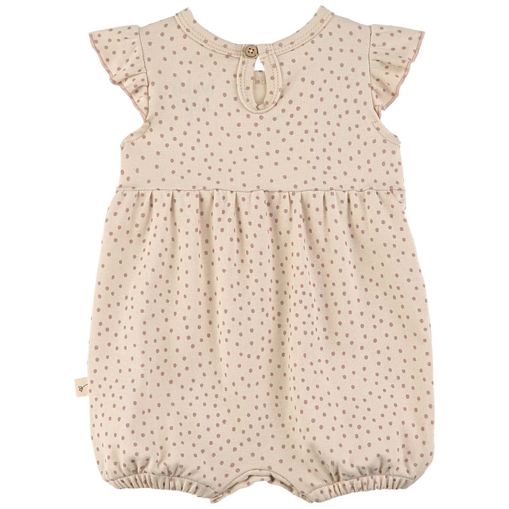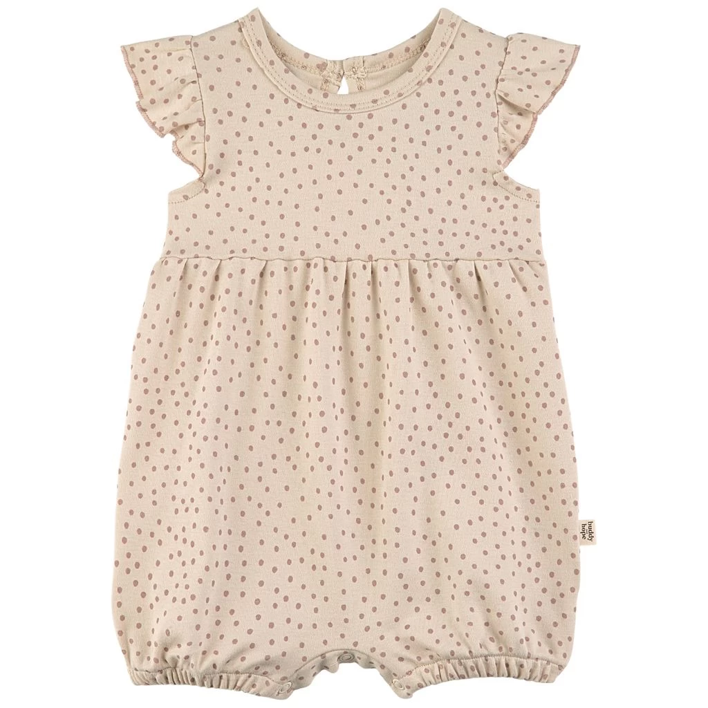 Let your baby explore and play in comfort. Cream Flora GOTS romper by Buddy & Hope. The romper has ruffle sleeves. It has a button closure at the back and snap buttons between the legs.