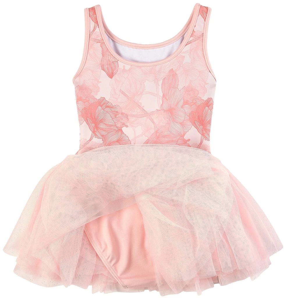 Pink Floral Print Tutu leotard by Mirella. The leotard has a stretchy material. It has soft lining and a tulle skirt.