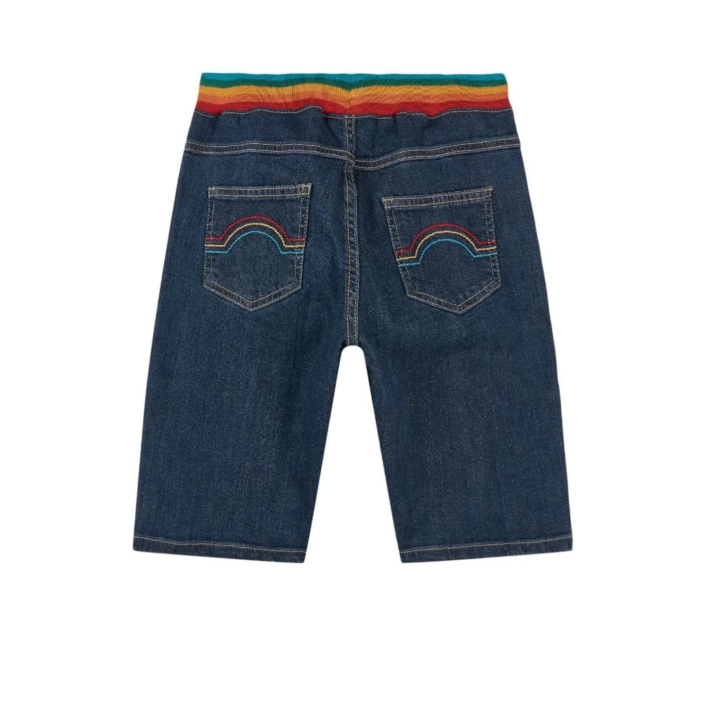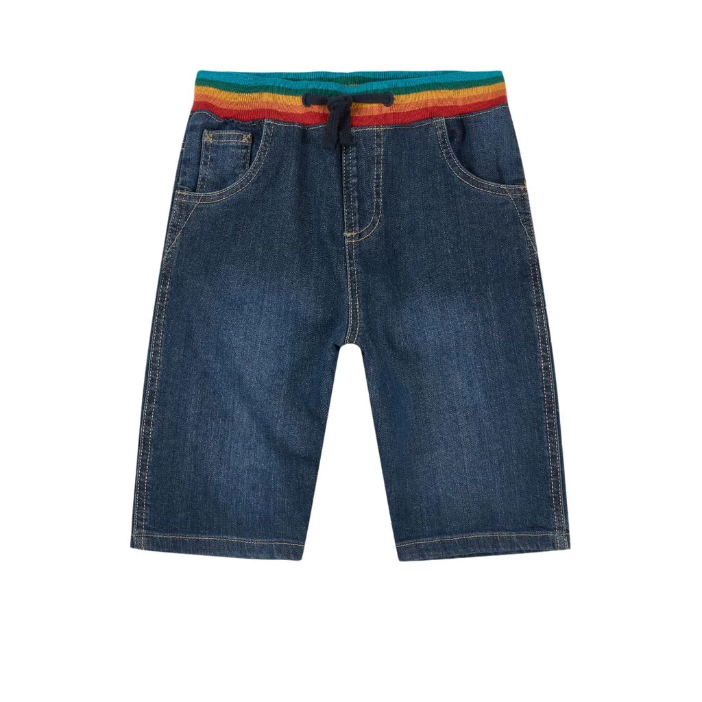Blue Dorian denim shorts by Frugi. The shorts have an elasticated drawstring waist. They have a 5-pocket design.