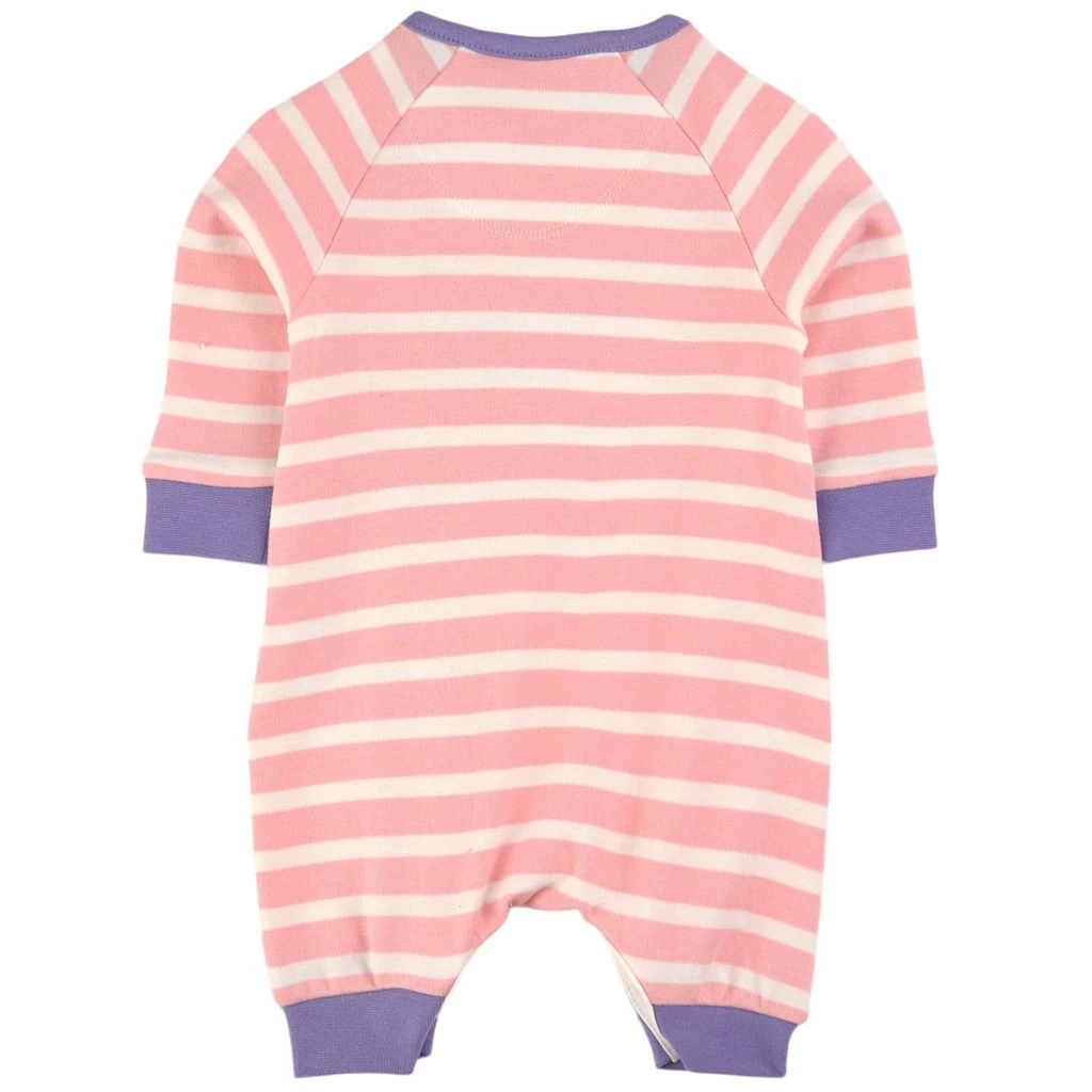 Add a pop of color to your day. Have fun on those adventures with this romper!. Pink, striped Flower Bird Remy one-piece by Frugi. The one-piece has a ribbed crew neck. It has snap button closures at the front and between the legs, an elasticated leg opening and ribbed cuffs.