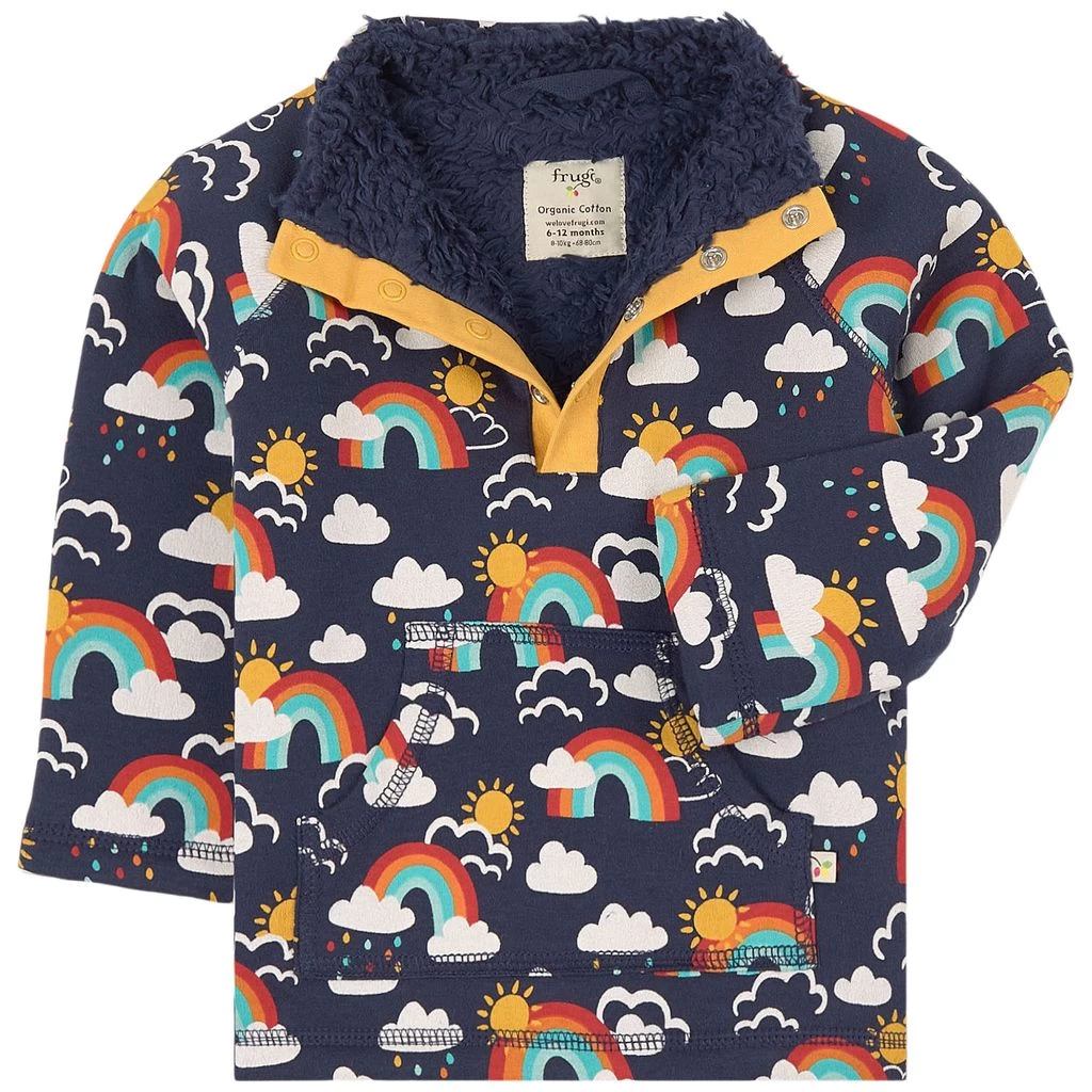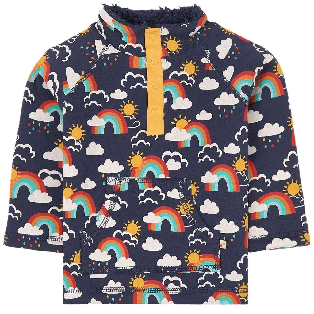 Navy Rainbow Snuggle fleece sweater by Frugi. The fleece sweater has a high collar with a snap button closure at the front. It has a kangaroo pocket at the front.