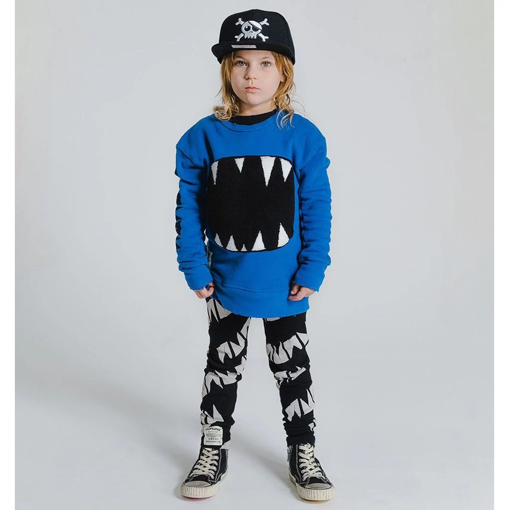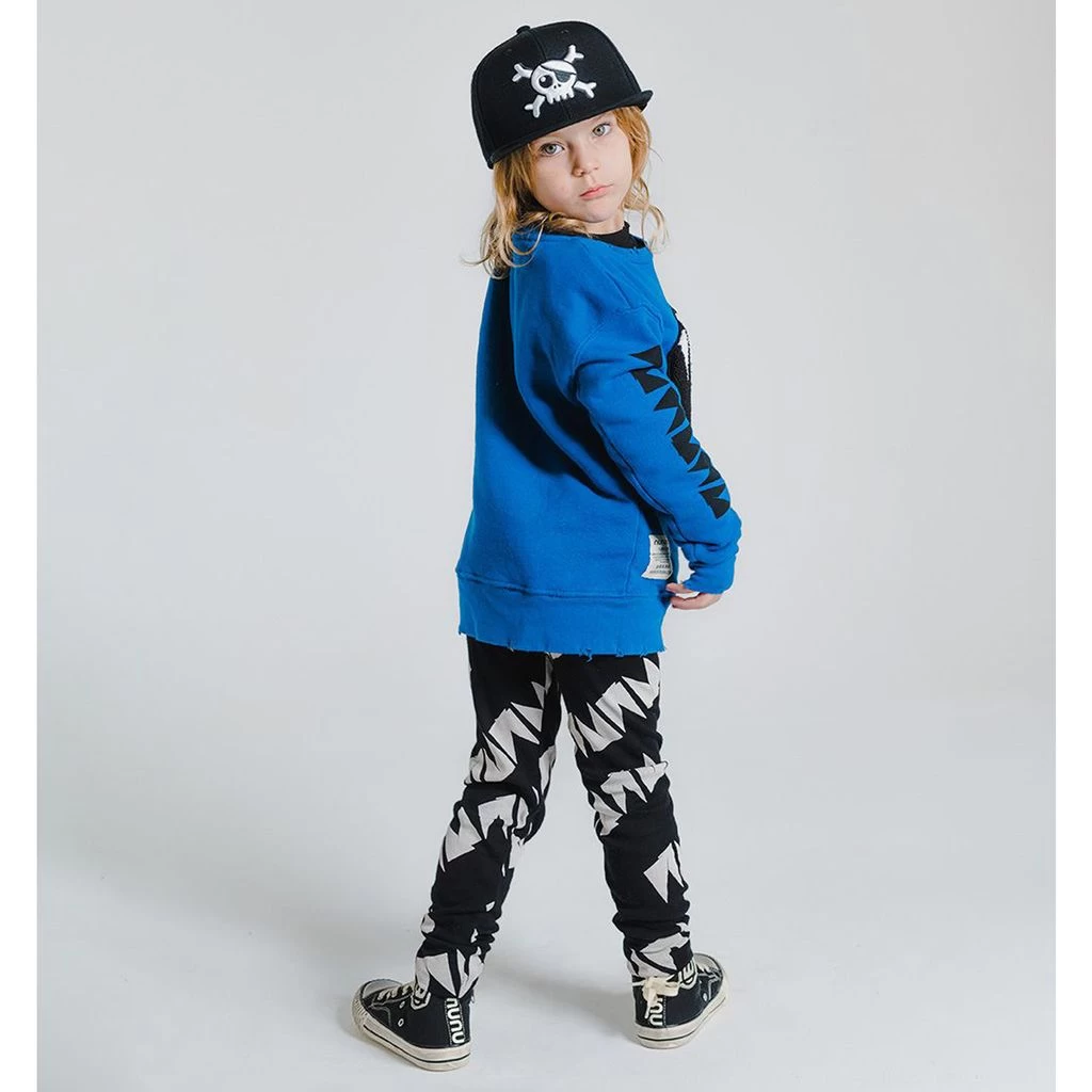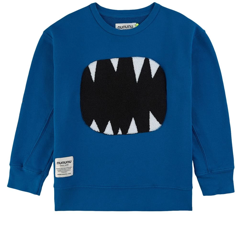 An on-trend and comfortable sweatshirt for everyday life. Blue Fuzzy Roar graphic sweatshirt by NUNUNU. The graphic sweatshirt has a worn look with ripped detailing. It has a textured graphic on the front, a brand patch on the bottom front and a text print on the sleeve.
