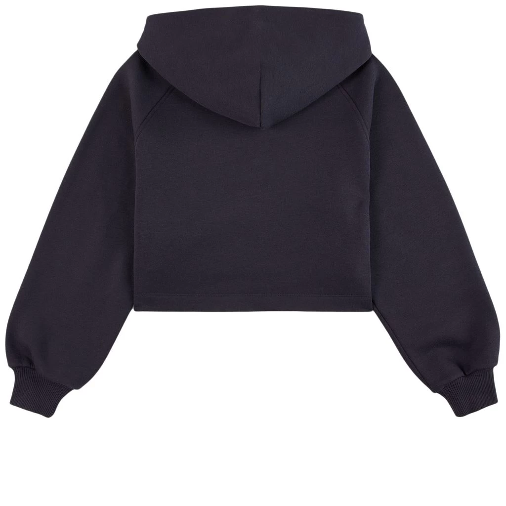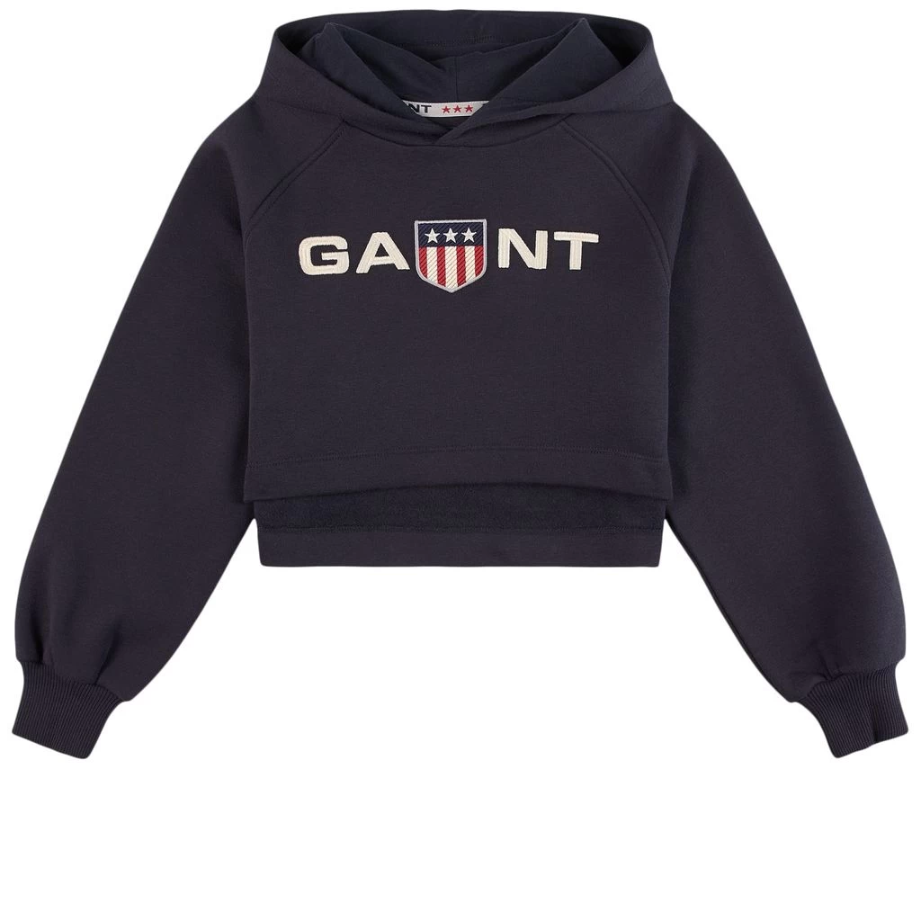 Navy Retro Shield hoodie by GANT. The hoodie has a relaxed cropped design. It has ribbed cuffs, a high-low hem and an embroidered logo at the front.