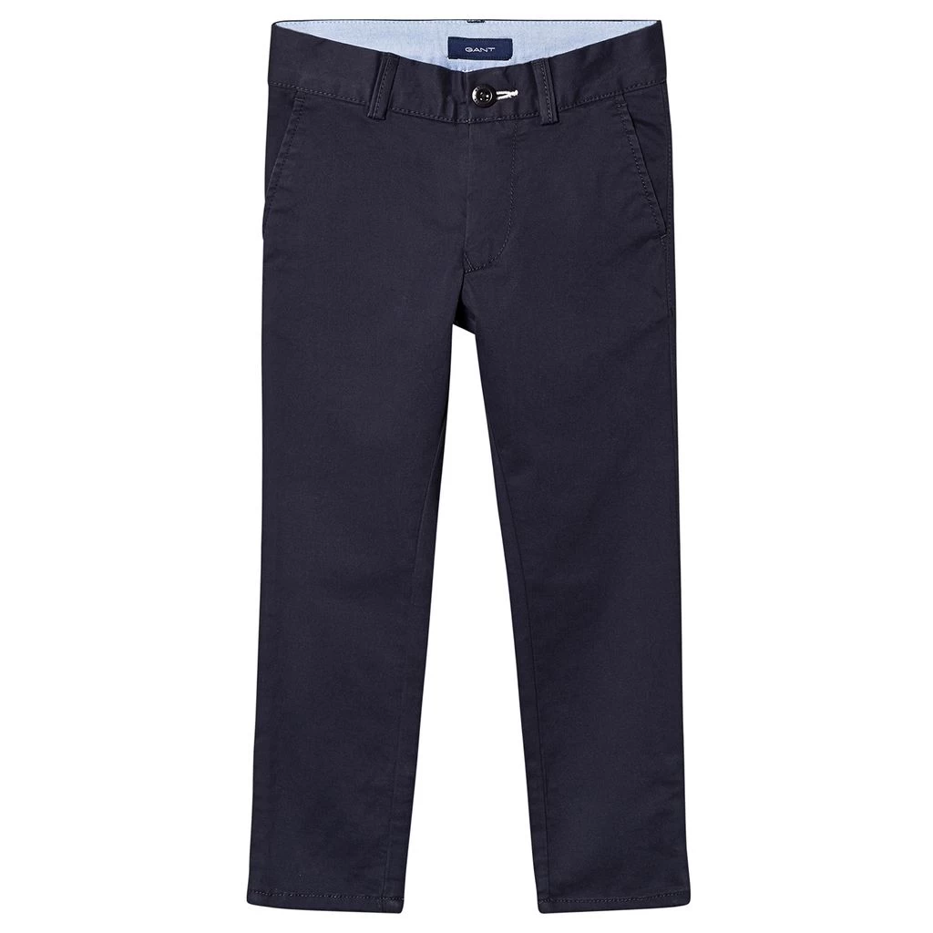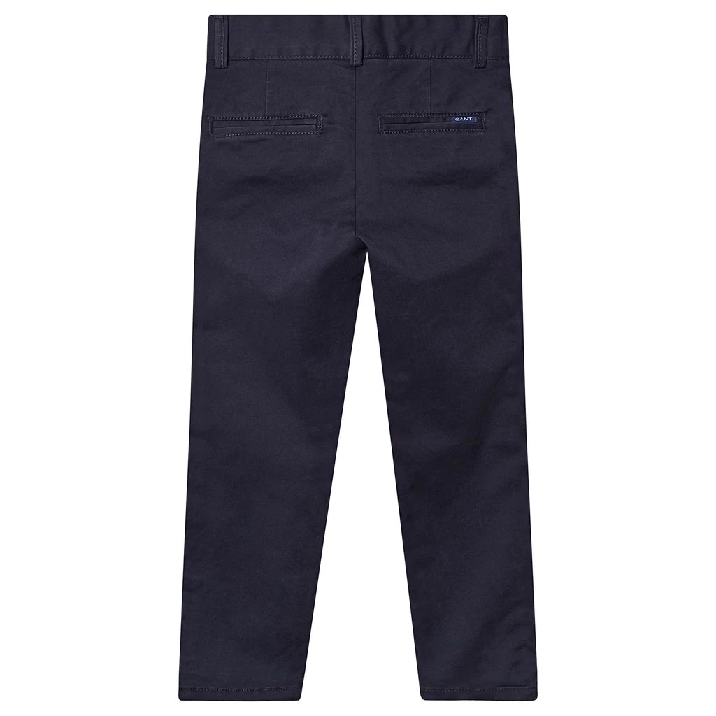 Navy Slim Fit chinos by GANT. The pants have a slim fit. They have an adjustable button-elastic waist, a zip fly with button, two front pockets and two back pockets.