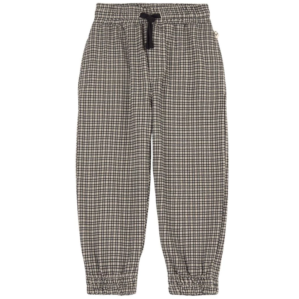 Pair these pants with a light sweater and you’ll be ready for anything. Light grey trousers by My Little Cozmo. The trousers have a gingham design. They have elasticated cuffs, an elasticated drawstring waist, two front pockets and two back pockets.
