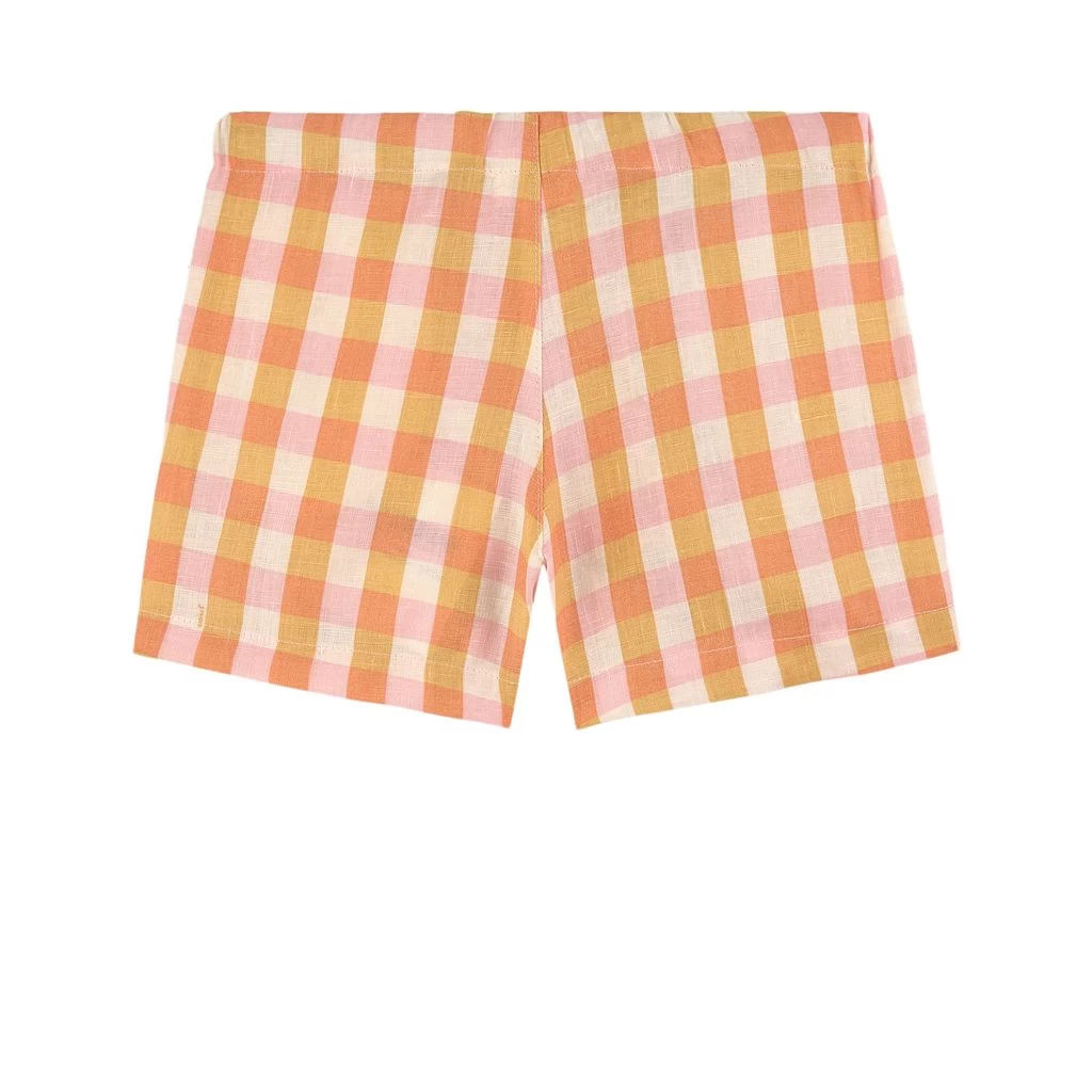 Perfect for warm summer days. Orange shorts by Oeuf. The shorts have a gingham pattern all over. They have an elasticated waist, an adjustable button-elastic waist, a zip fly with a button and two slanted front pockets.