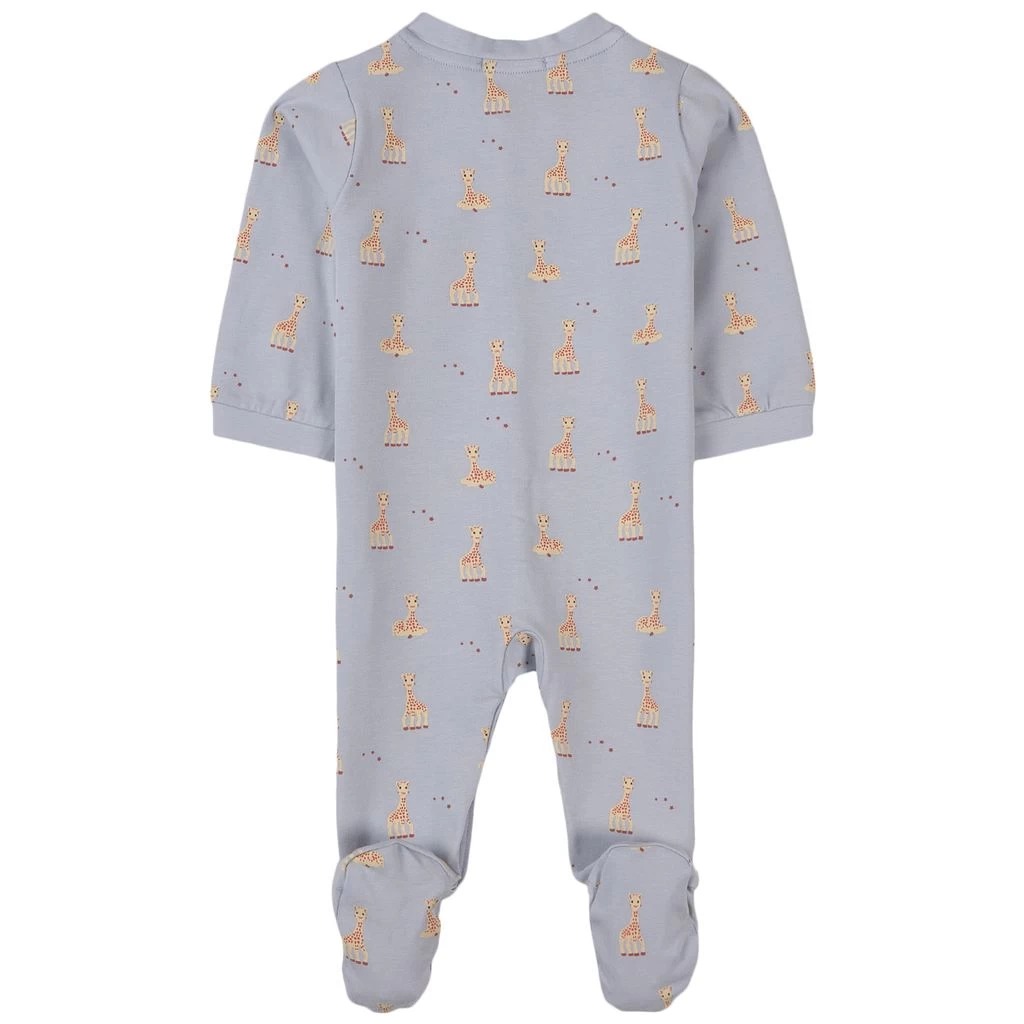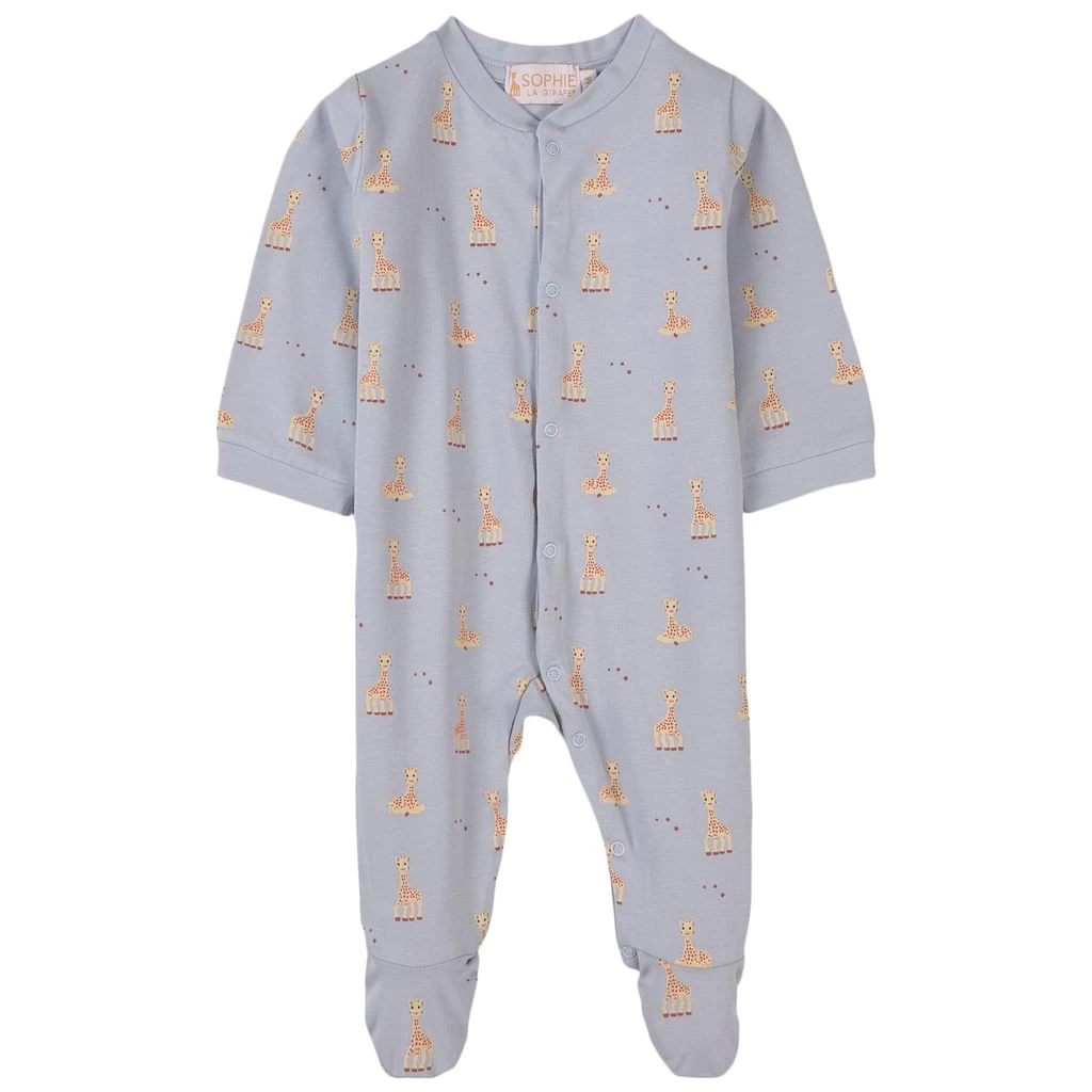 Blue Giraffe footed baby body by Sophie the Giraffe. The footed baby body has an all-over print. It has a snap button closure at the front and down the leg.