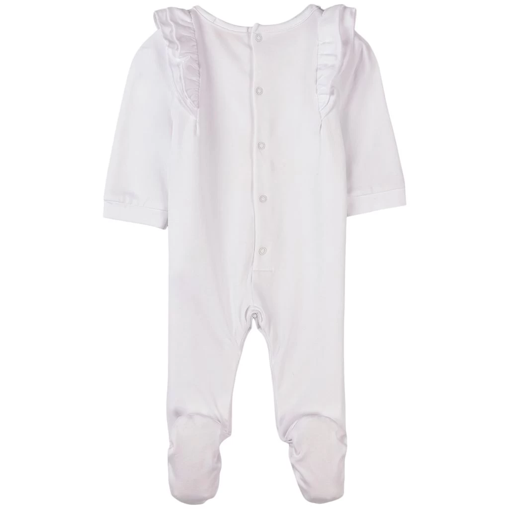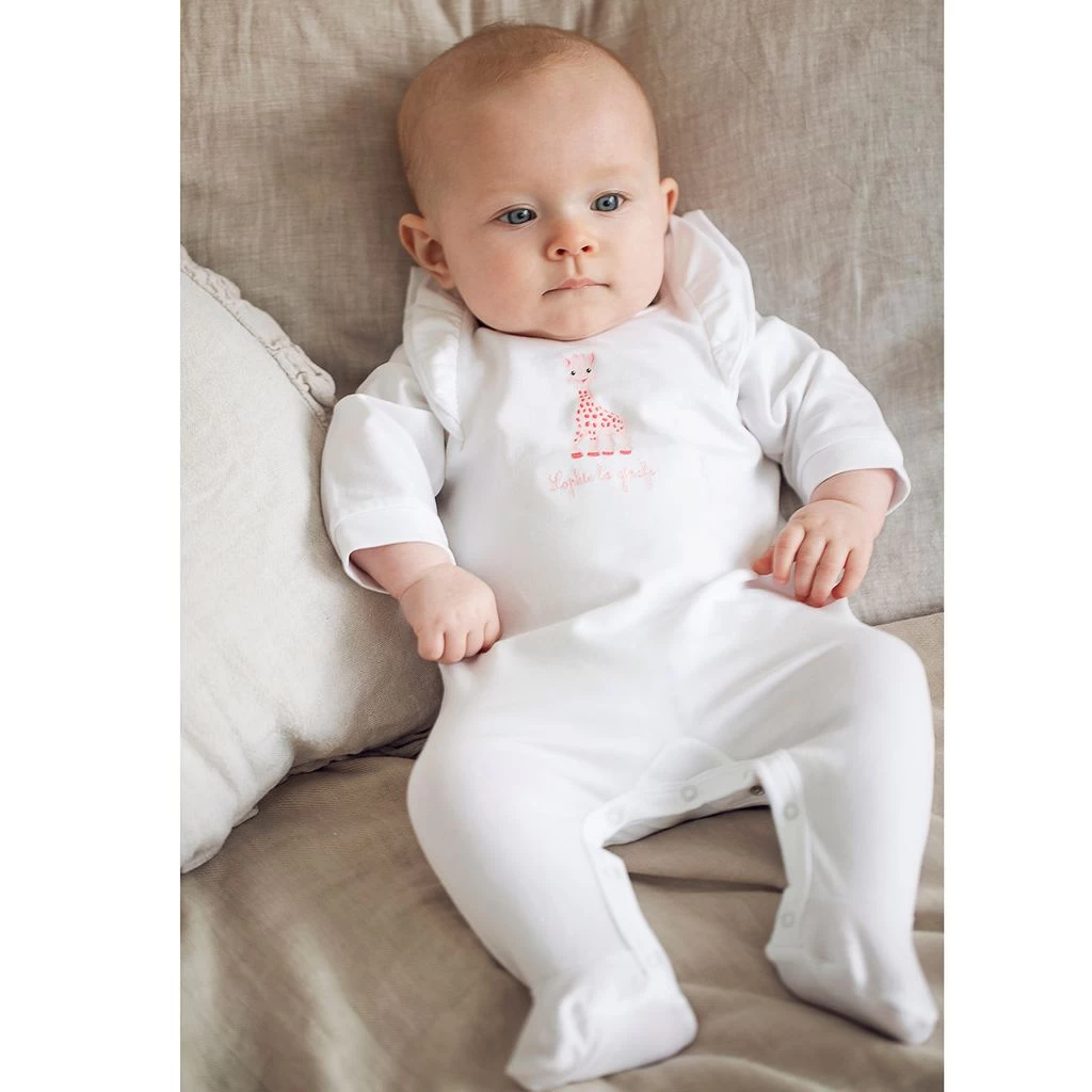 White Giraffe footed baby body by Sophie the Giraffe. The footed baby body has a print at the front. It has a snap button closure at the back and between the legs and ruffle details.